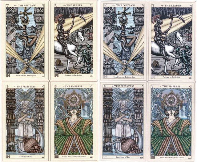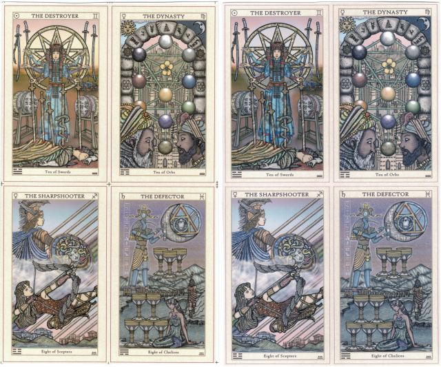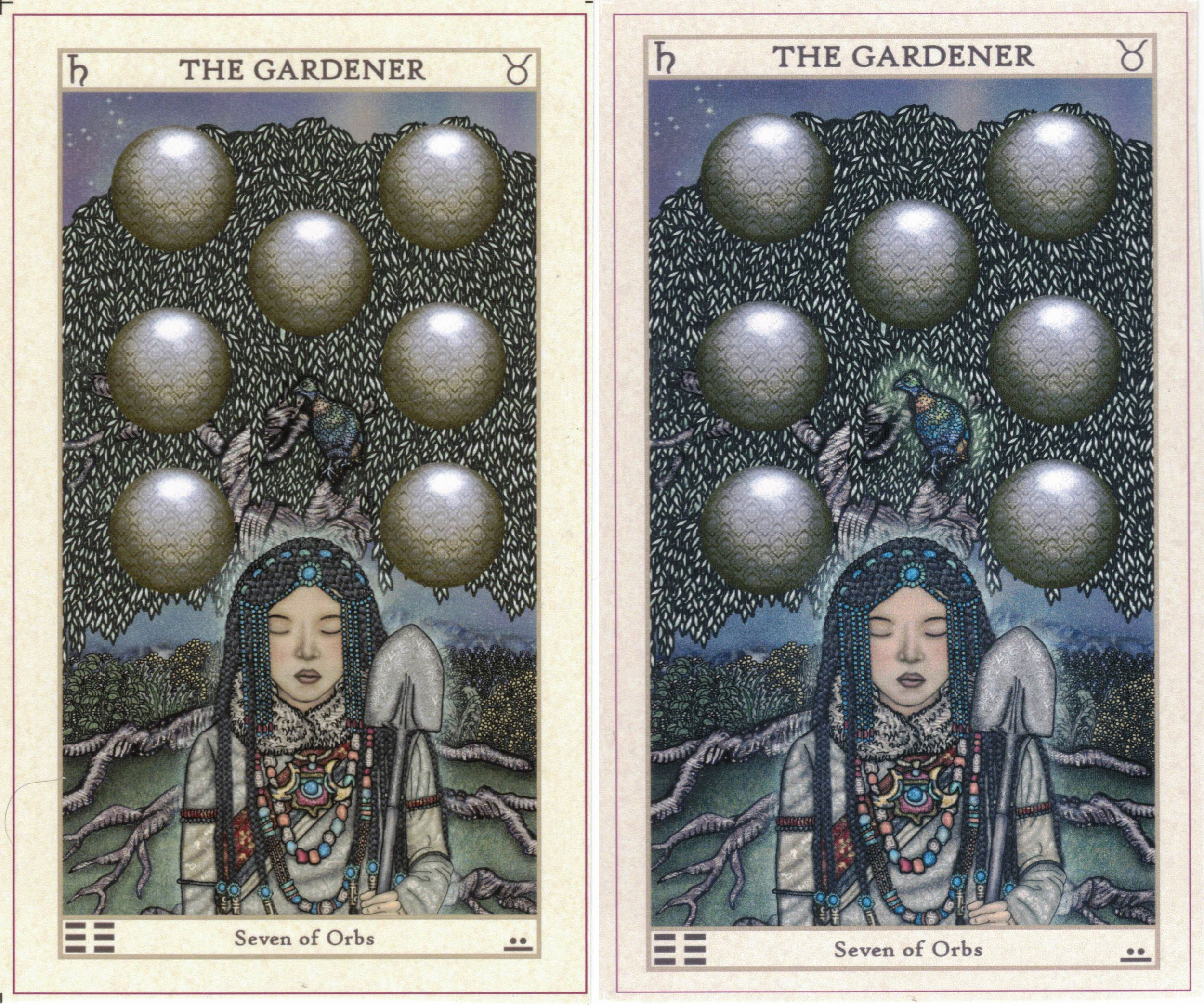 Most cards I like the first version but one or two cards, I like the bluer/purple version like the 10 of swords and the surrounding green on the birds on The Gardener. I hope the print will eventually go back to the warmer colors as before.