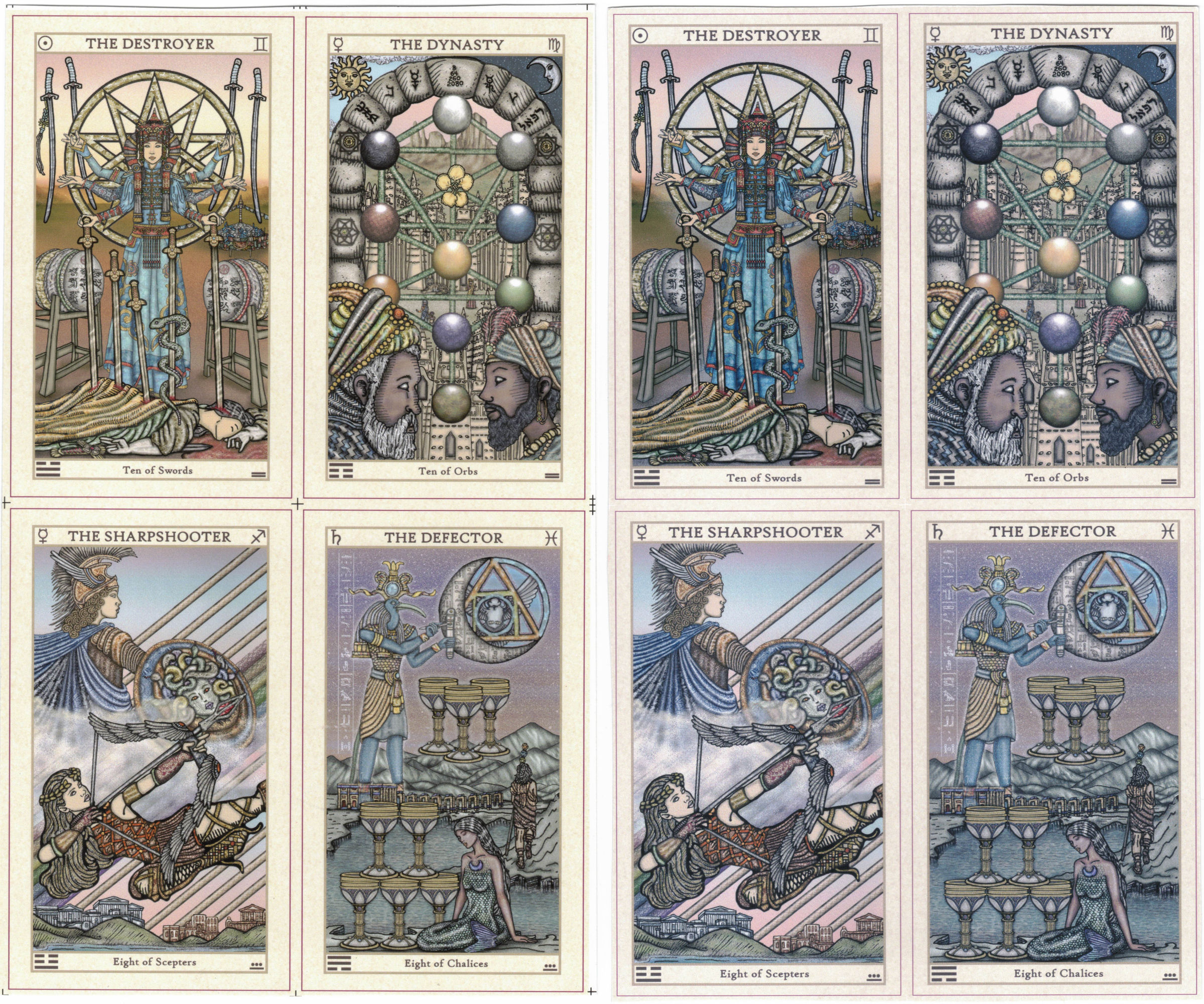But I made no changes at all to the background, yet look how different the hues are between the pink skies in the left and right versions. In the Eight of Scepters (The Sharpshooter), compare the reds on Artemis vs. the one on the right. Look at the Eight of Chalices, where the dullness of the color tones is a lot more pronounced. The 2021 version was brighter and seems to be more crisp.