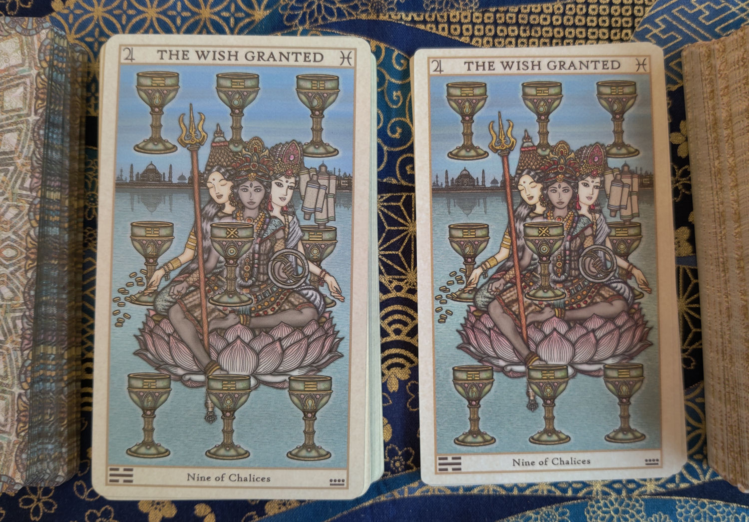 The warmer and richer saturation is most pronounced where there are reds. See above left for the First Print Run actual decks and above right for the proofs approved for the Second Print Run.