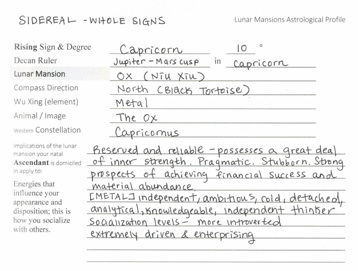 For example, my natal sun is domiciled in Wings (South, Fire, Snake); my natal moon is domiciled in Star (South, Yang, Horse); and my ascendant sign is domiciled in Ox (North, Metal, Ox).