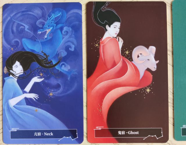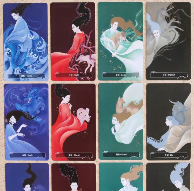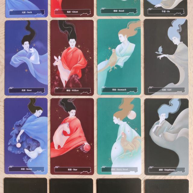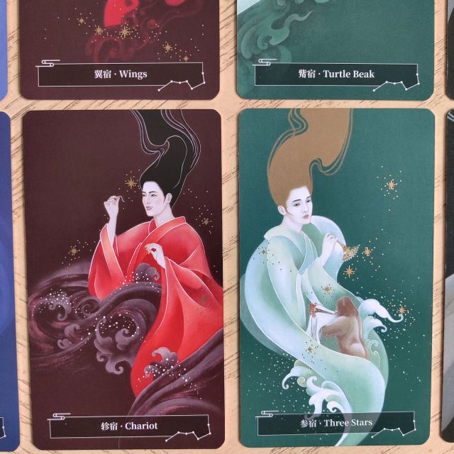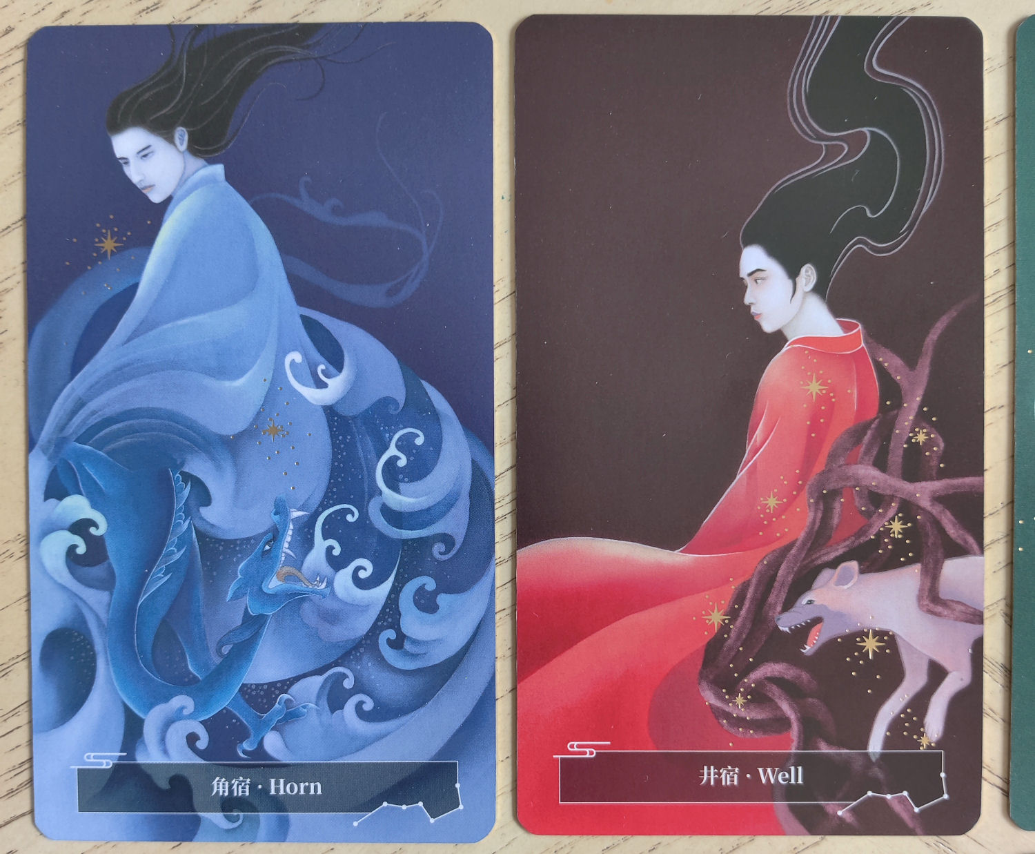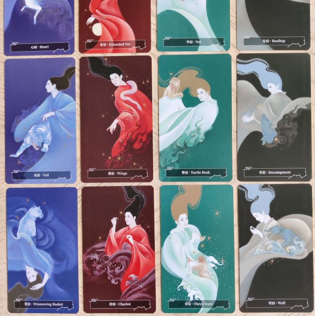 In the Oracle cards, the cards for mansions associated with the Azure Dragon are color-coded blue, then red for the Vermilion Phoenix (noted as Bird in the guidebook), silver-white for the seven White Tiger mansions, and charcoal and black for the Black Tortoise.