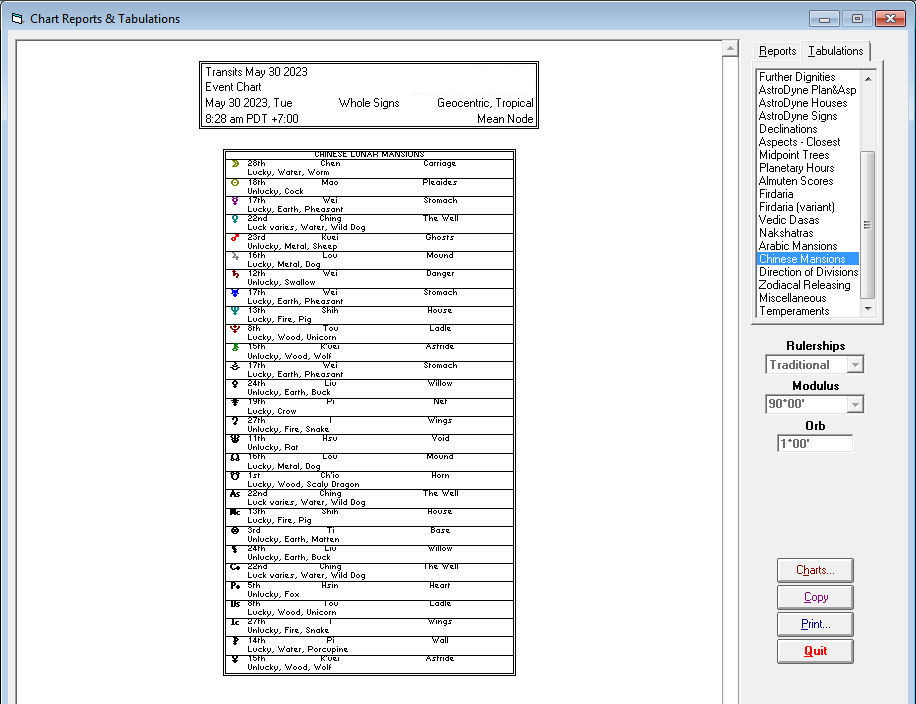 Practice Tip: If you’re an astrologer who uses Solar Fire, generate your horoscopic chart, then click on “Charts Reports & Tabulations” (see above highlighted icon), then the tab “Tabulations” and the chart “Chinese Mansions.” You’ll get an output of all the lunar mansion correspondences of your natal planets and key personal sensitive points.