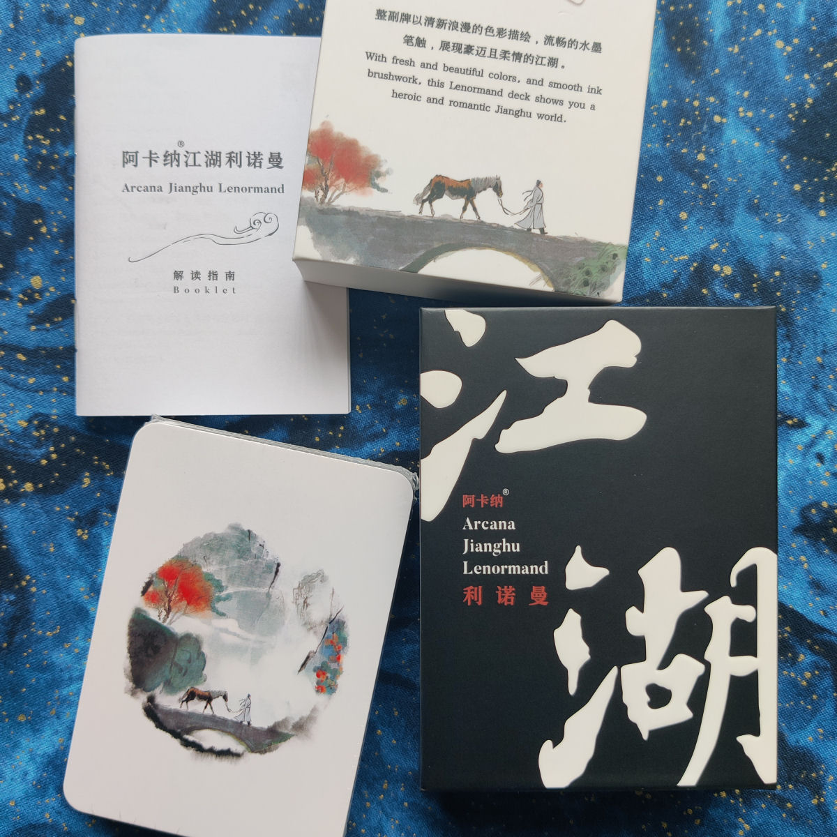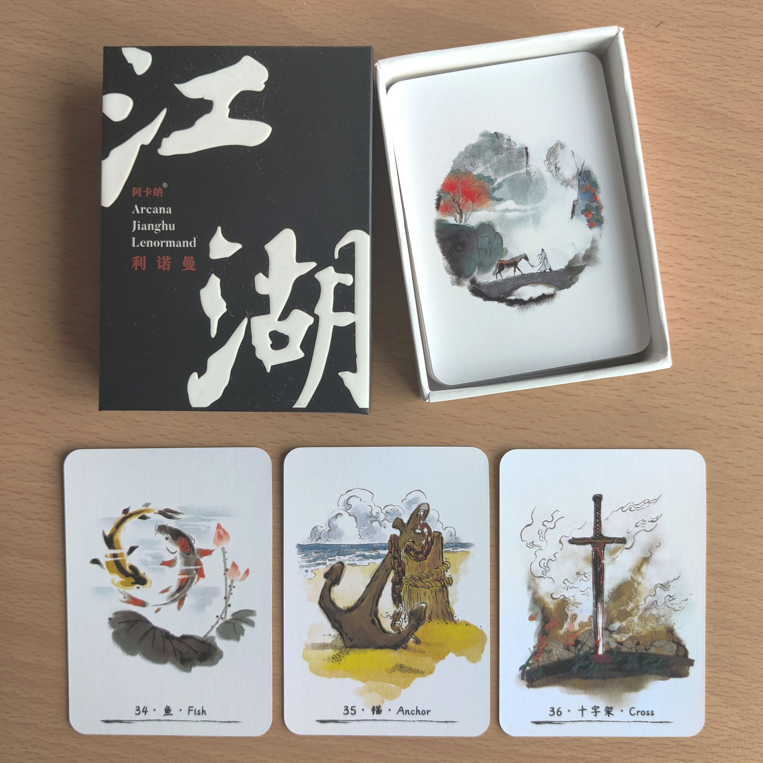 I love the creative changes to the Lenormand for it to express Jianghu, such as milk mutton jade ornaments as love tokens for the Heart, card 24. The Cross, card 36, is a blood-stained sword upon a battlefield.