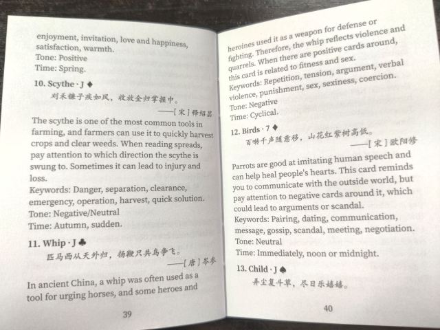 Although this deck doesn’t feature the playing card correspondences, you’ll find them in the little white booklet (LWB). Actually, the LWB provides a really concise yet comprehensive primer on reading with the Lenormand. It’s written by Li Sha and translated into English by Wolper Luo.