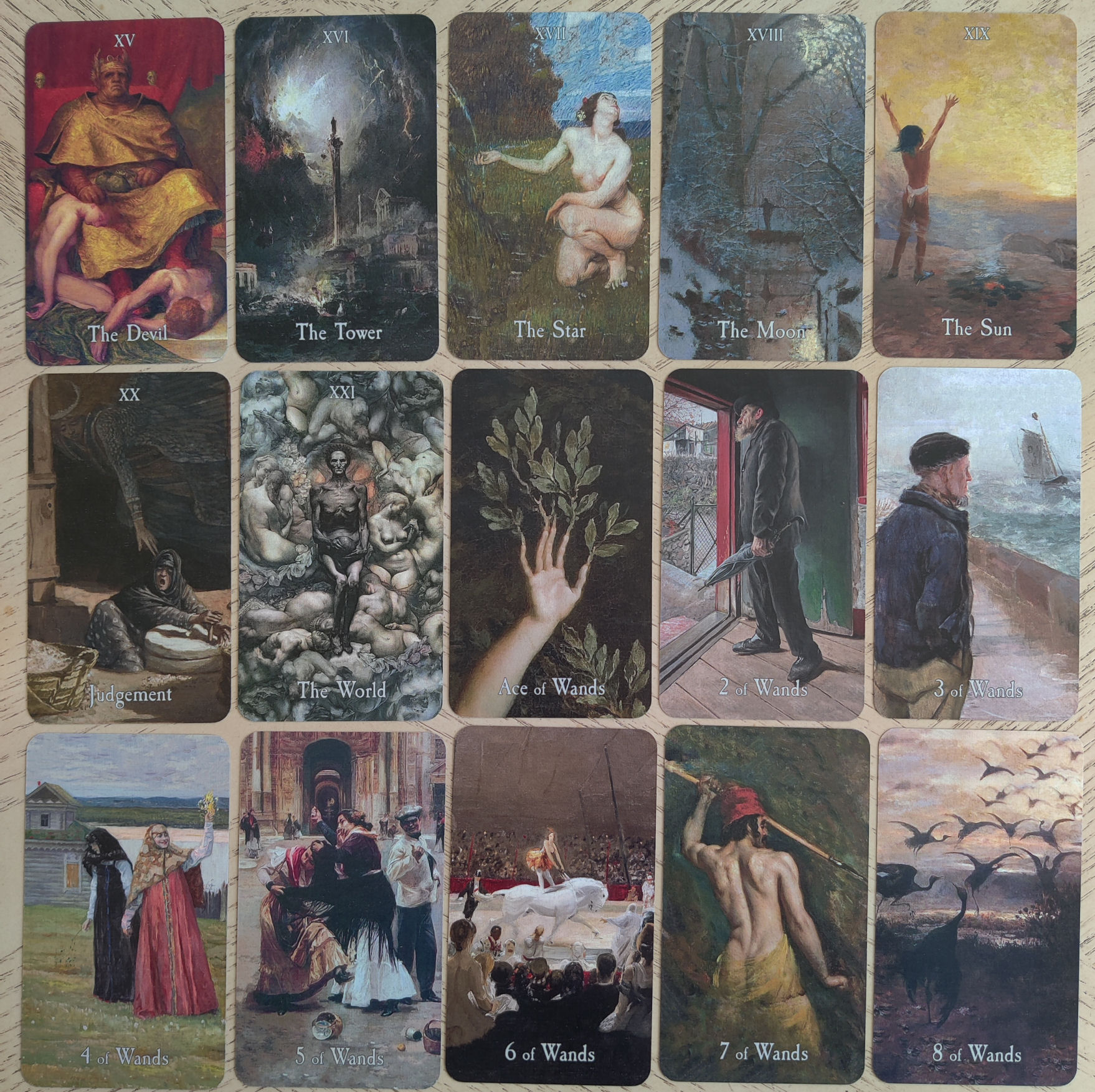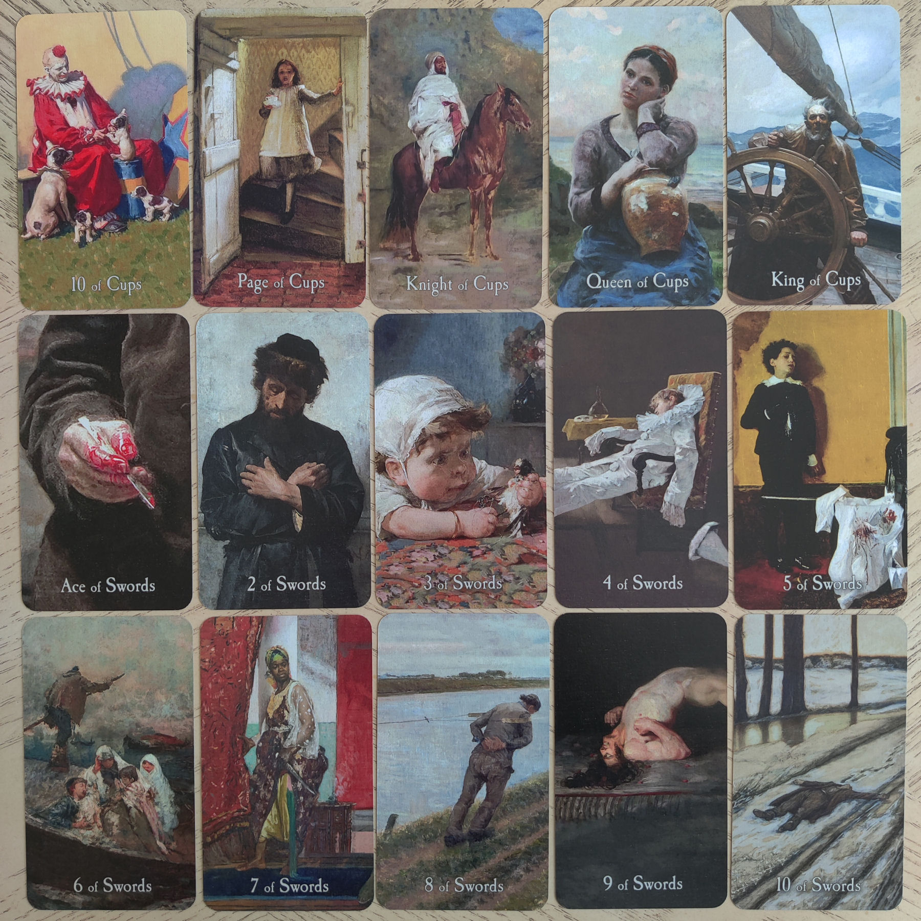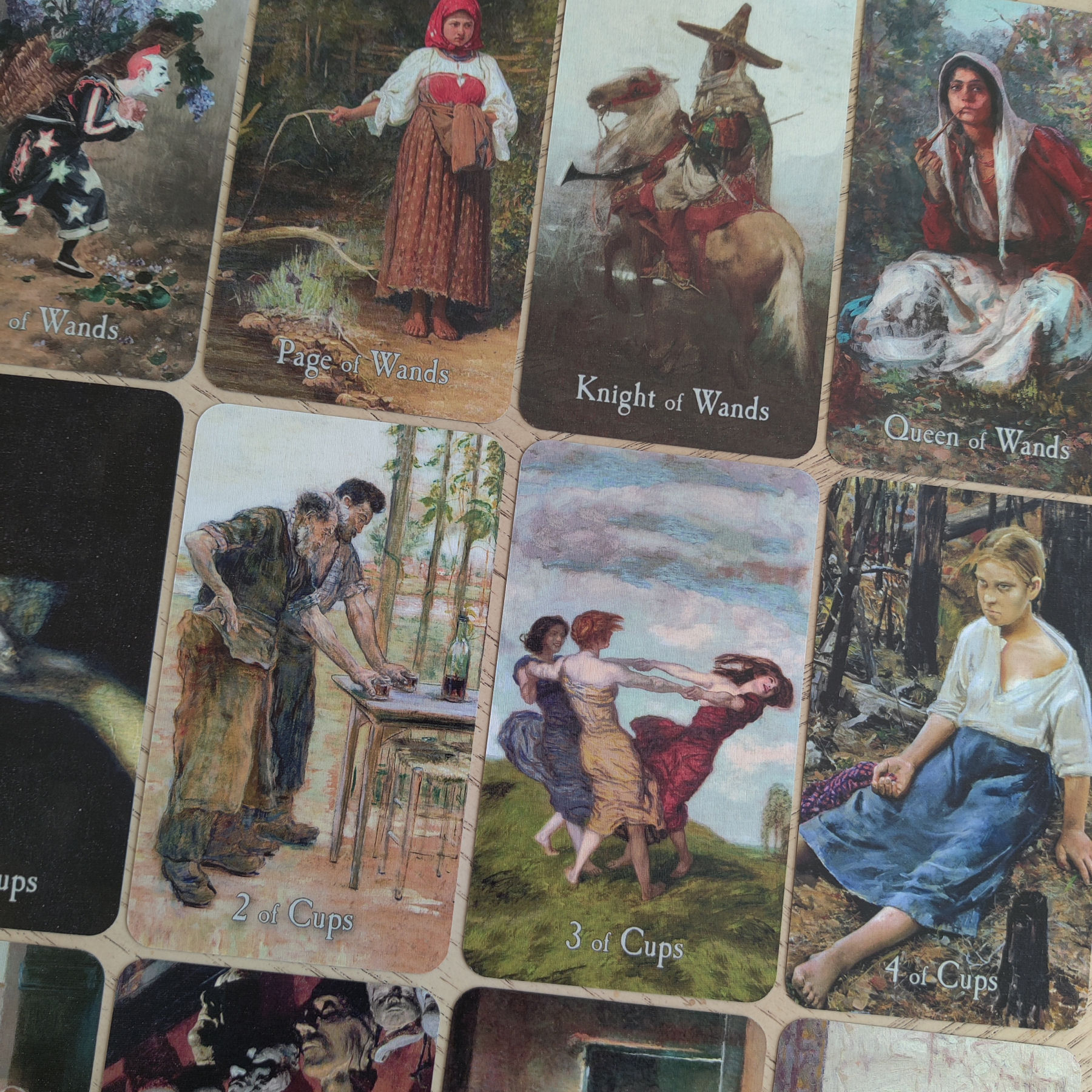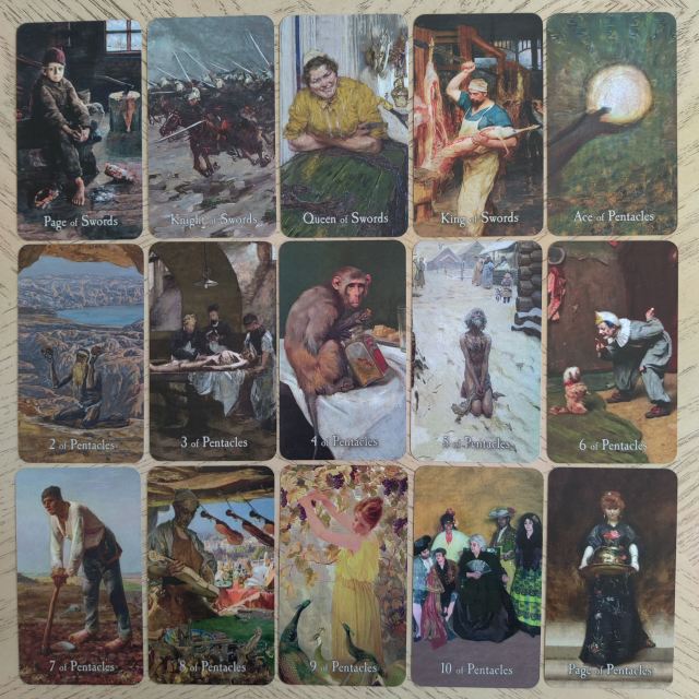 You’ll also enjoy Realists such as Illya Repin or Wilhelm Trübner, and the illustrator N. C. Wyeth, or works from the portrait and esoteric painter Beatrice Offor. The cards become a hand-held fine arts gallery, each work of art carefully curated and attributed to each of the 78 archetypal keys. In our everyday setting, I see poets and academics seated in a coffeehouse reading with the Pensive Path Tarot.
