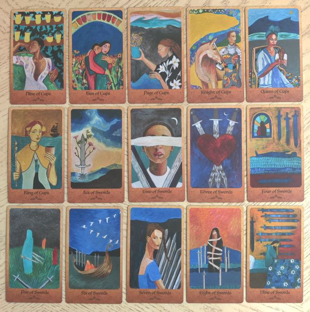 I love the blue edging– color therapy for healing. The seamless card back design hearkens back to the blanket design in the Nine of Swords. This deck is the antidote for anyone experiencing the Nine of Swords.