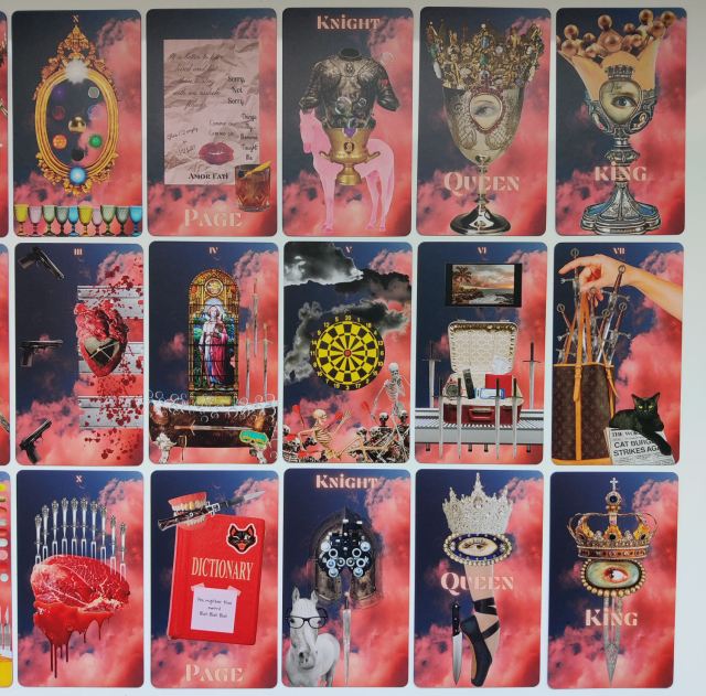 Really loving that Two of Swords image, and instead of swords, the Three of Swords features three guns pointed at a heart. Collage art as a medium is often about exploring identity and memory, which is why they are often evocative of dreamscapes and described as dreamscapes. To me, the KLD Tarot showcases the identity and memory of a femme skatecore Gen X-er.