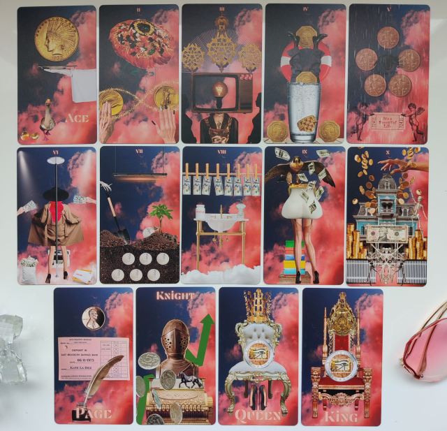 This is a photo walk-through of the KLD Tarot by Kate La Dez Studios. It’s a modern photo collage deck that features a candy pink and midnight violet-blue color contrast that recurs throughout the cards.