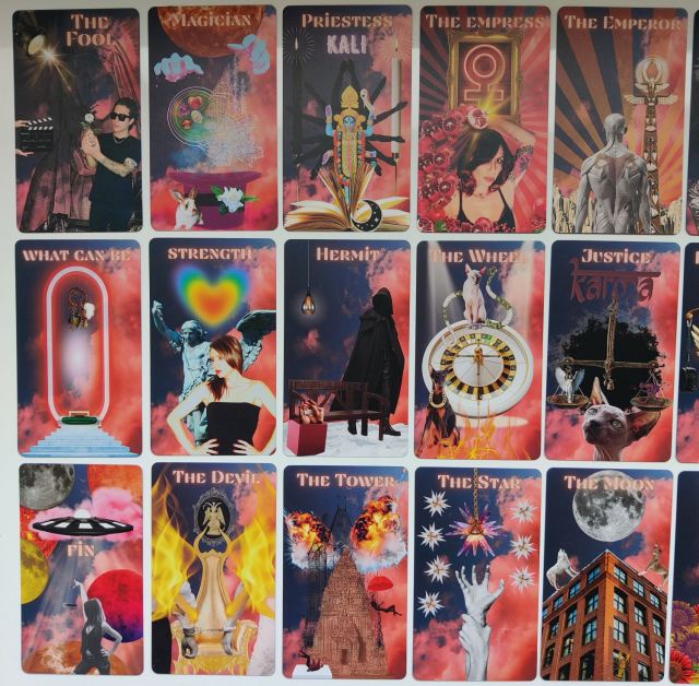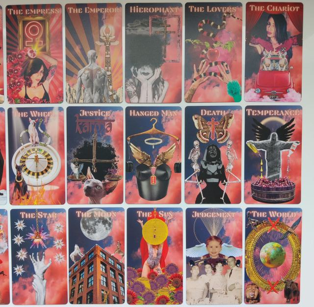 There’s a melodic skate punk, SKA, pop rock vibe to the KLD Tarot. These collaged images are like an homage to 80s and 90s subculture — dynamic and high energy with funky tongue-in-cheek humor.