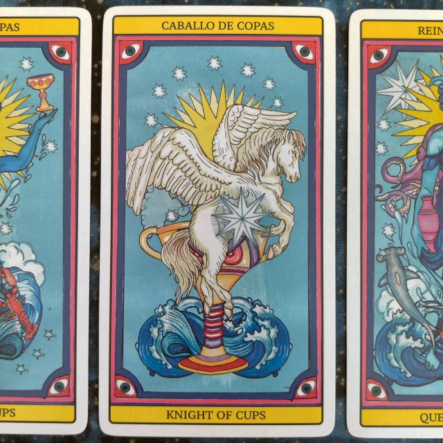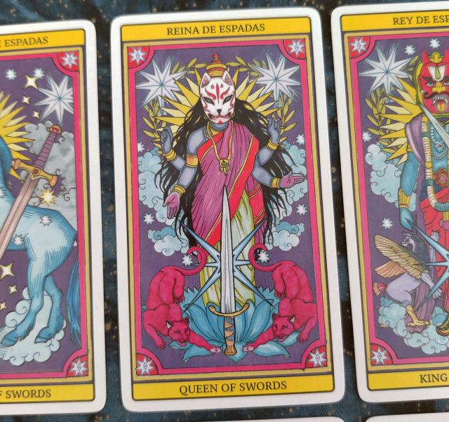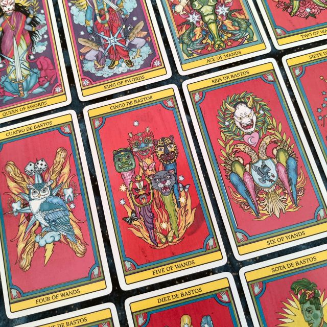 There have been some discussions on whether these illustrations would be considered cultural appropriation. Comfort levels will vary, for sure. As I see it, Navarro is pushing the envelope, but also, isn’t that what progressive artists do? It wasn’t my takeaway that the artist was trying to present these depictions as culturally orthodox or authentic to heritage and tradition; in fact, the irreverent tongue-in-cheek mish-mashing would suggest an artist fully self-aware of intentionally pushing the envelope to come up against people’s comfort levels. So to that end, Tarot de El Dios de los Tres is about presenting an integrated and pluralistic world view. Navarro isn’t trying to imitate established cultural traditions; he’s undertaking new art piecemealed from old that is avant-garde. Foreseeably, that is going to provoke. Some will be excited by what they see, others will be offended by it. Either way, it’s art.