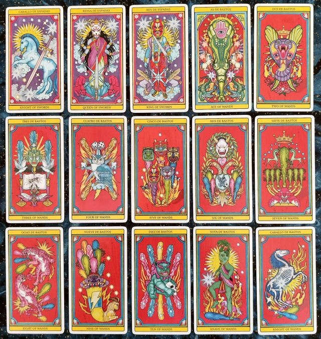 STUNNING! I’ve never seen it at all. The colouring is very reminiscent of the Tarot del Fuego but that’s where the similarities seem to end. Oh how i WISH there was a meaty book to go with it walking through all the symbolism within the deck. So many mixed mythologies yet they all seem to speak to each other so well. And the colour theory too!