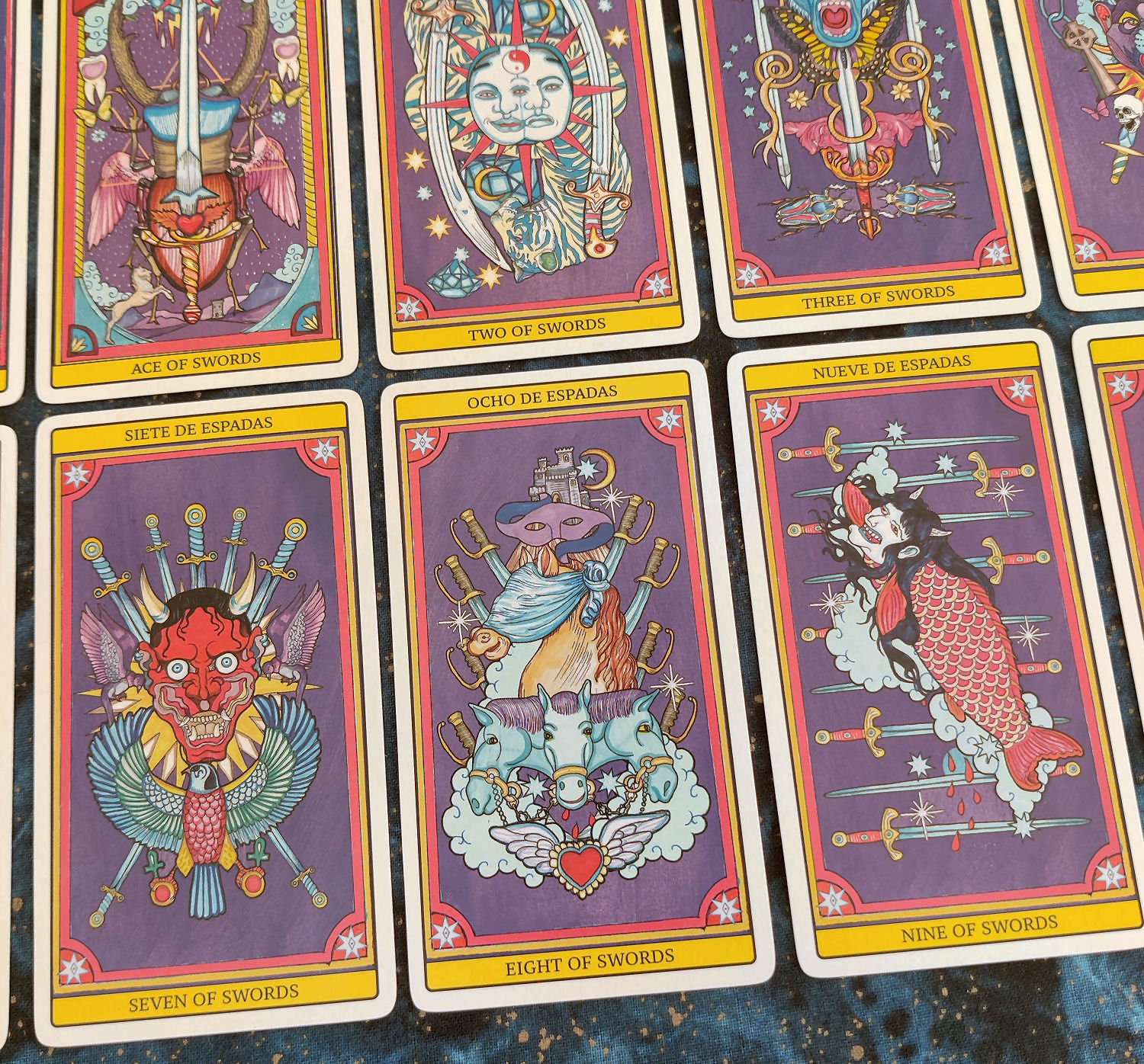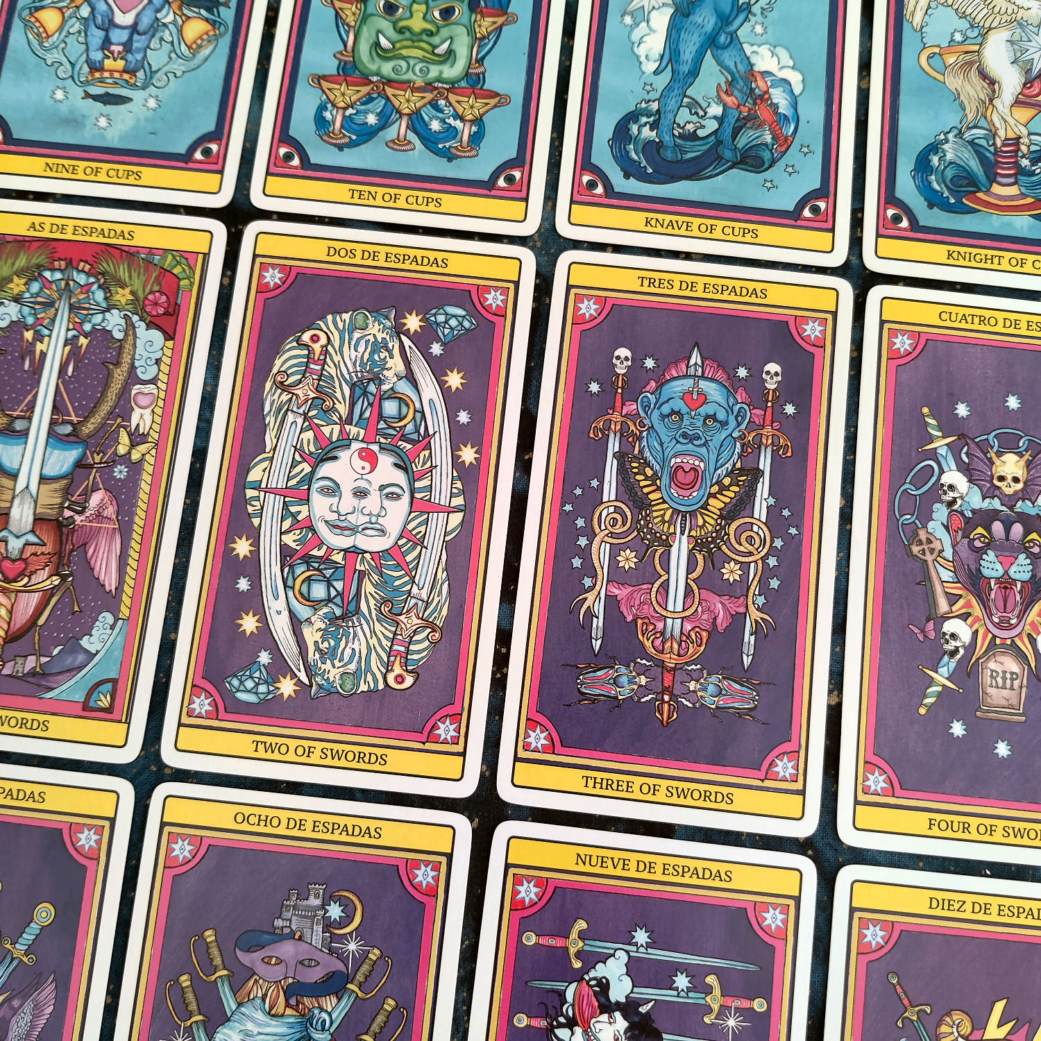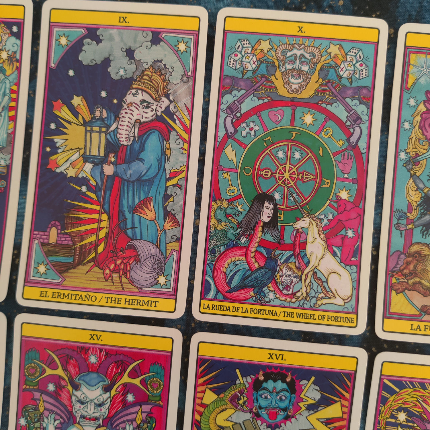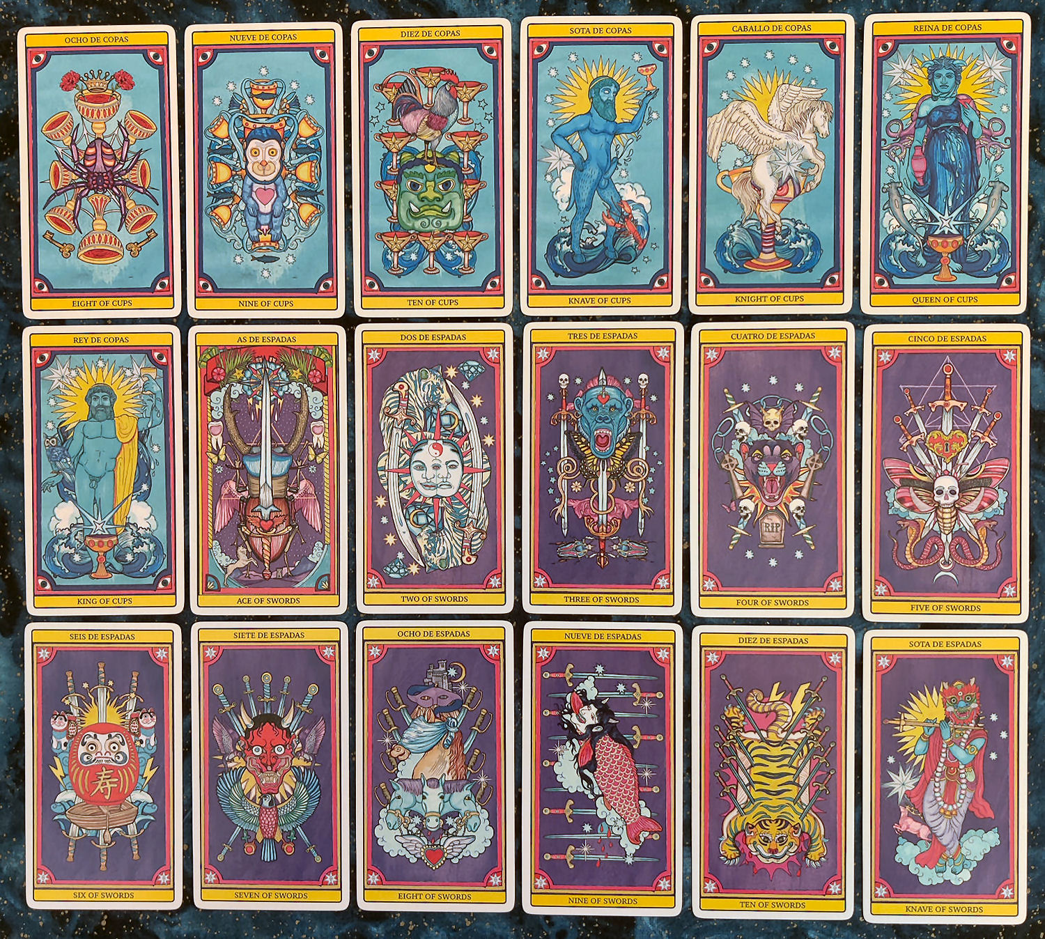 There have been some discussions on whether these illustrations would be considered cultural appropriation. Comfort levels will vary, for sure. As I see it, Navarro is pushing the envelope, but also, isn’t that what progressive artists do? It wasn’t my takeaway that the artist was trying to present these depictions as culturally orthodox or authentic to heritage and tradition; in fact, the irreverent tongue-in-cheek mish-mashing would suggest an artist fully self-aware of intentionally pushing the envelope to come up against people’s comfort levels. So to that end, Tarot de El Dios de los Tres is about presenting an integrated and pluralistic world view. Navarro isn’t trying to imitate established cultural traditions; he’s undertaking new art piecemealed from old that is avant-garde. Foreseeably, that is going to provoke. Some will be excited by what they see, others will be offended by it. Either way, it’s art.