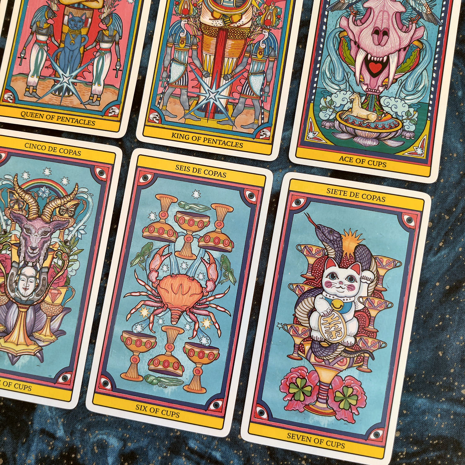I love decks that are multicultural and really weave in a blend of cultures from around the world… this is a wonderful take on that. The only other deck that gives me a mix of cultures in a deck is Tarot of the Devine. This one, in particular, exudes playfulness without losing face on the cards inherent meanings/depictions. Question is… is it still in print? And can we get more artists to fuse various cultural myths and representations into one deck?