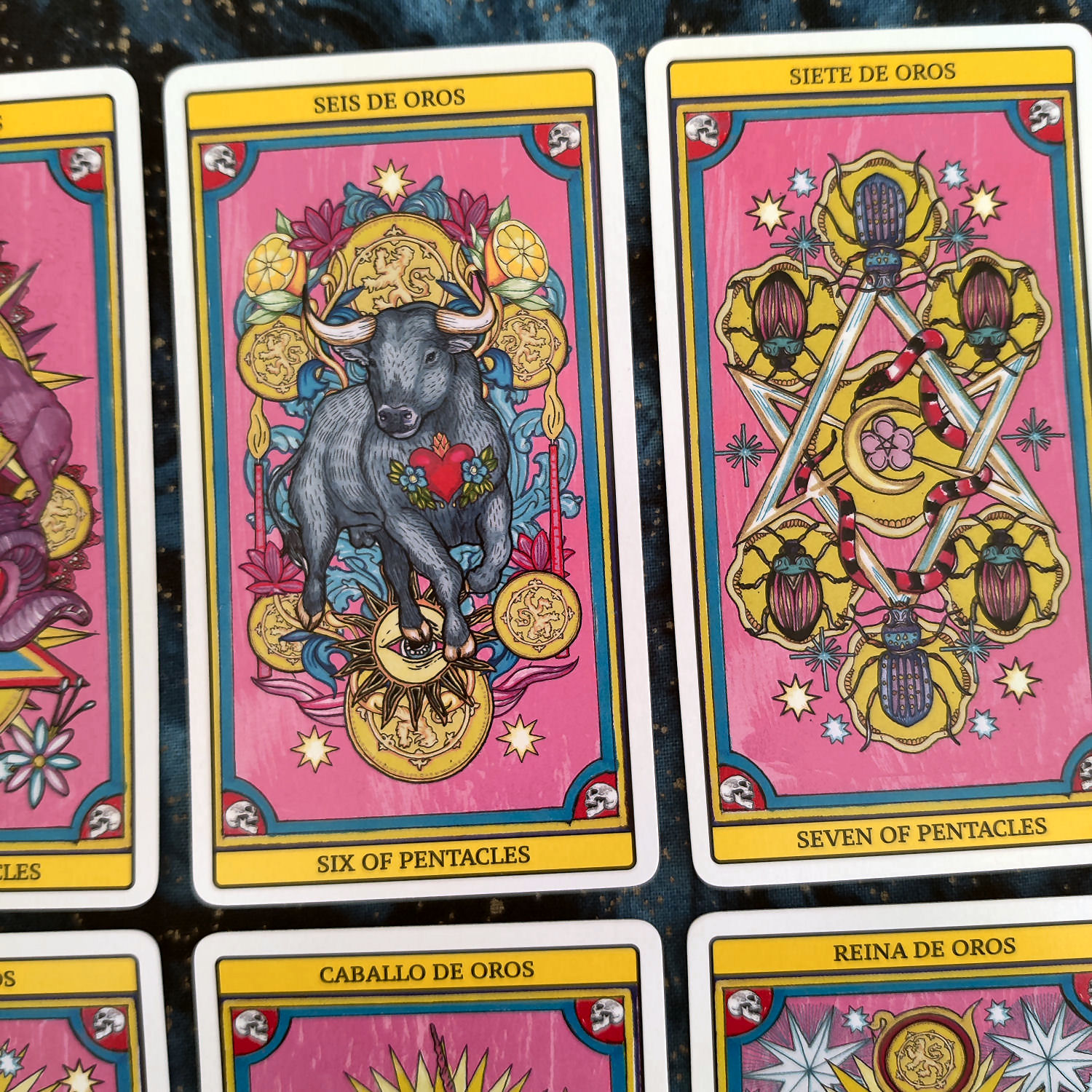 STUNNING! I’ve never seen it at all. The colouring is very reminiscent of the Tarot del Fuego but that’s where the similarities seem to end. Oh how i WISH there was a meaty book to go with it walking through all the symbolism within the deck. So many mixed mythologies yet they all seem to speak to each other so well. And the colour theory too!