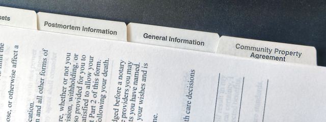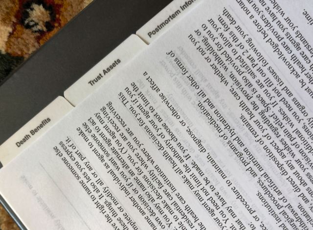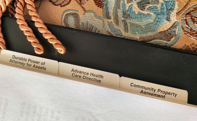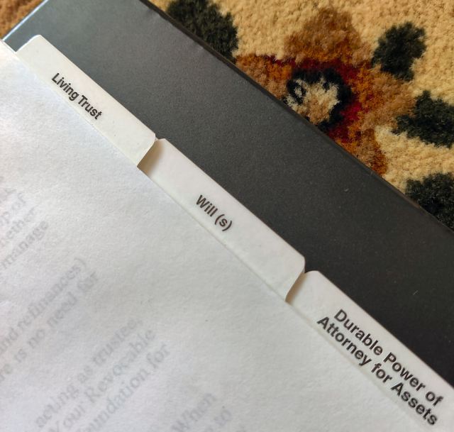 Once all documents have been completed, signed, and executed, my recommendation is to keep them in a three-ring estate planning binder with divider tabs. Label the divider tabs by document name — the living trust (if you decide to have one) sits alone under one divider tab, your last will and testament sits alone under another divider tab, and so on. I would also recommend buying plastic folders that fit into the three-ring binders where you can store all manner of documents and photocopies of documents that your loved ones might need in order to administer your last wishes.
