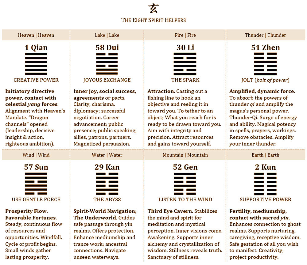 In tarot and I Ching divination, when you draw the Magician, Chariot, Strength, Justice, Temperance, or Moon, it reveals one of the eight (again the 8) spirit helpers corresponding with Xuan, meaning Mystery. The paired card drawn with the Xuan card reveals one of the 8 doubled hexagrams in the 64 hexagrams of the I Ching.