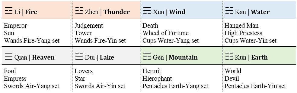 Plenty of Western occultist folks have endeavored to reconcile the tarot and I Ching systems, from Crowley to several modern practitioner takes. I find this particular approach, accounting for the aspects of astrology and astronomy that are universal in both Eastern and Western thought, reconciliation with Kabbalistic principles, and resonant with the core themes and meanings of each card, to work the best. And make the most sense.