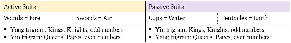 “Water-Yin” means it’s from the Passive Suits column, because we see that Water is a Passive suit. Yin refers to the Kings, Knights, and odd numbers when in a Passive suit, such as the Cups. Therefore Kings, Knights, and odd numbers from the suit of Cups (Passive) correspond with Water.