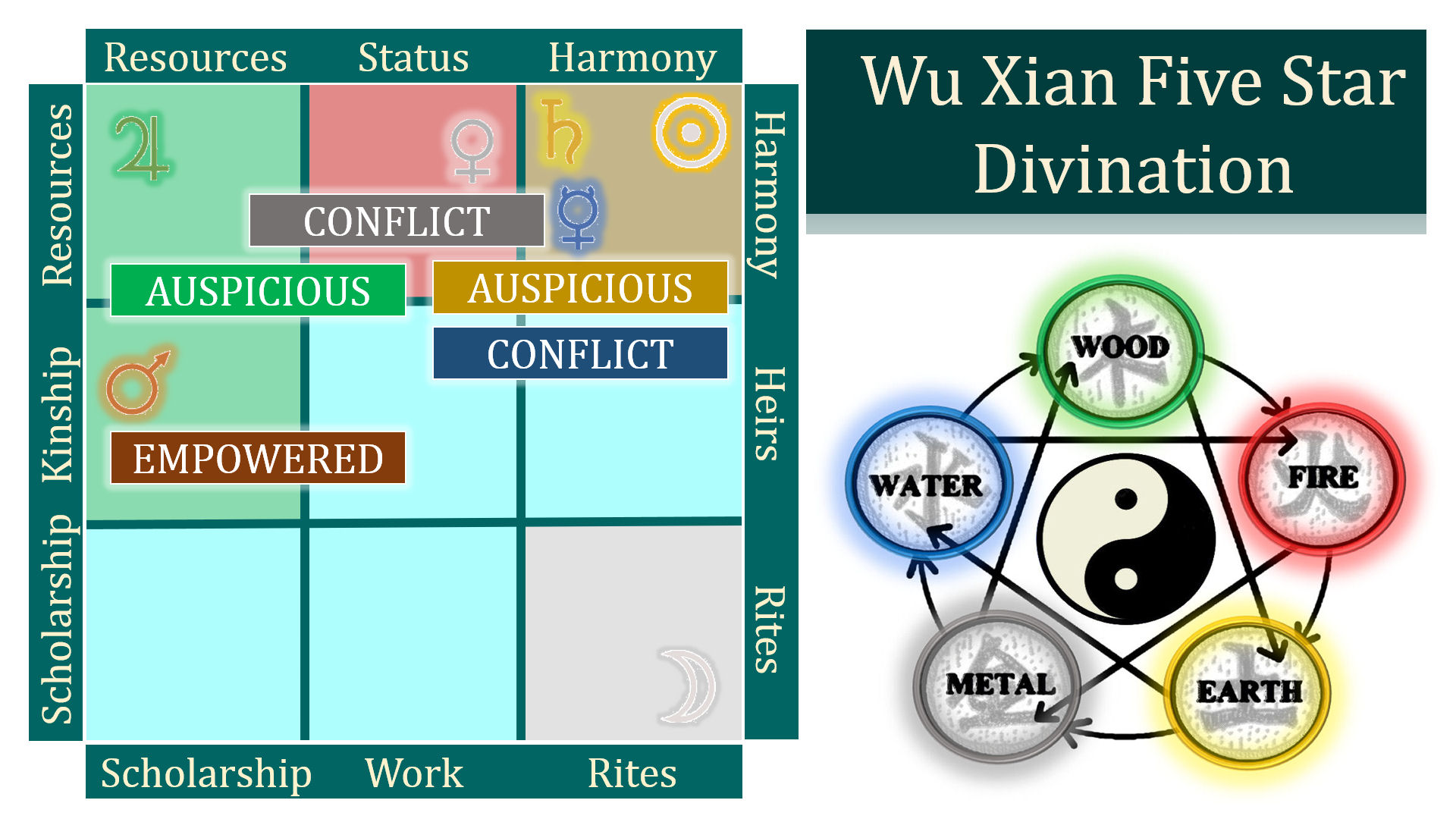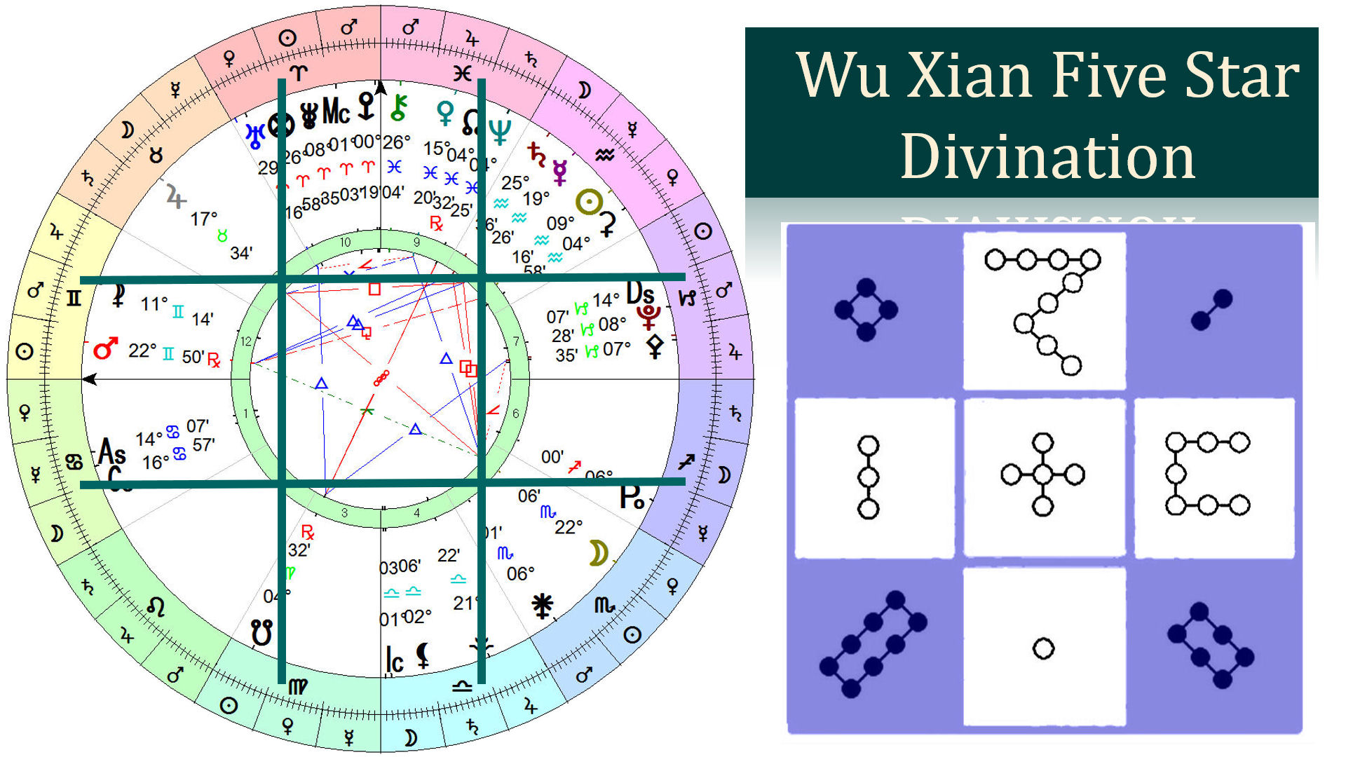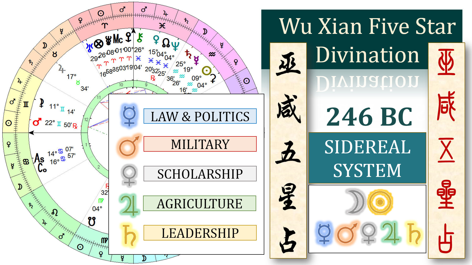 Wuxian’s Five Star Divination 巫咸五星占 is a system of astrology that dates back to the Qin dynasty, around 246 BC during Qin Shihuang’s reign, documented in a manuscript from that era titled Five Star Divination 五星占, the “five stars” being Mercury (Water), Venus (Metal), Mars (Fire), Jupiter (Wood), and Saturn (Earth). The astrological text is attributed to Wuxian 巫咸, and so this system of astrology became known as Wuxian’s Five Star Divination.