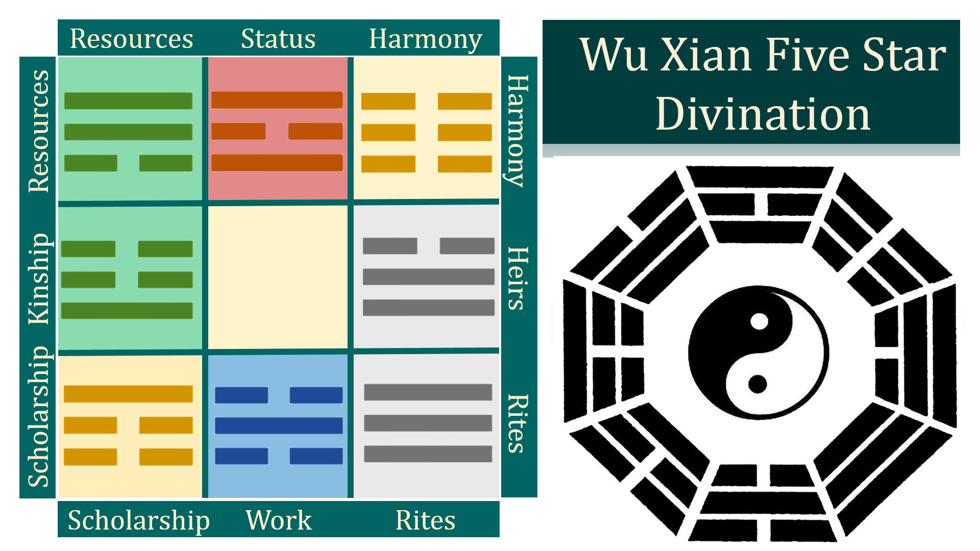 In Five Star Divination, the horoscopic chart is the nine-sector Lo Shu magic square. The correspondences for each of the nine sectors mirror the feng shui correspondences of the Lo Shu we still use today.