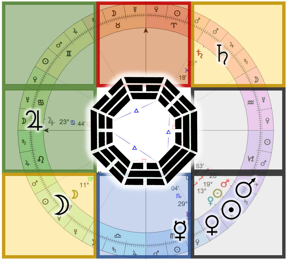 Within each of the nine sectors (the Lo Shu), one of the five Wu Xing elements is considered dominant. Each of the five planets is also assigned a Wu Xing elemental dominance. Then the alchemical interaction between the elemental trait of the sector (the “astrological house”) and the planet determines the interpretation. So it’s really similar to Western astrology!