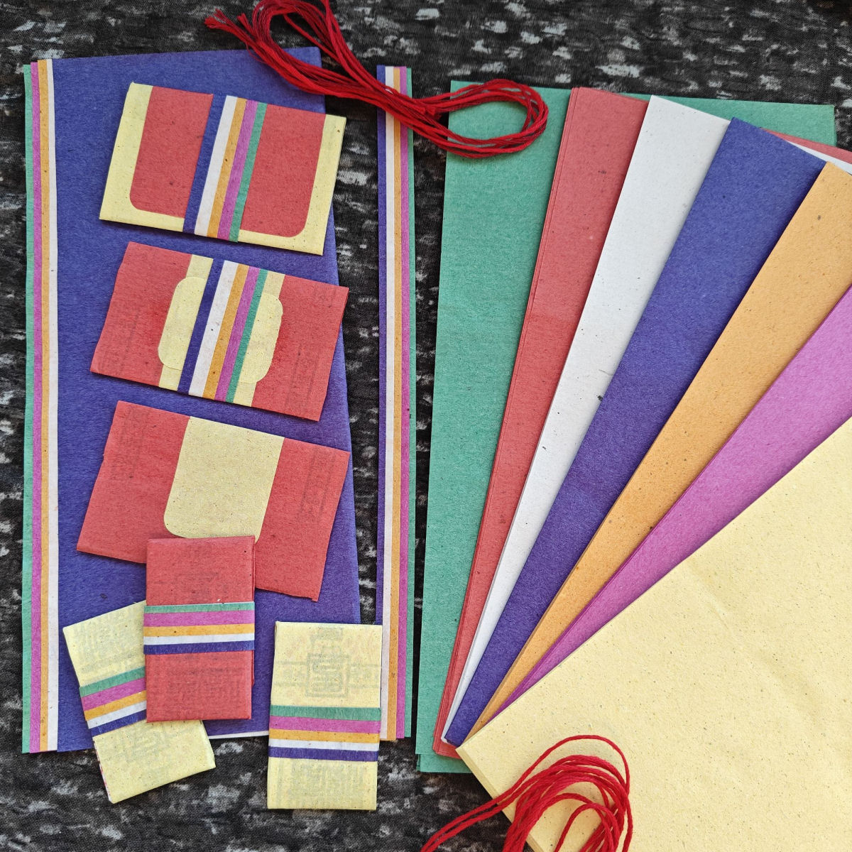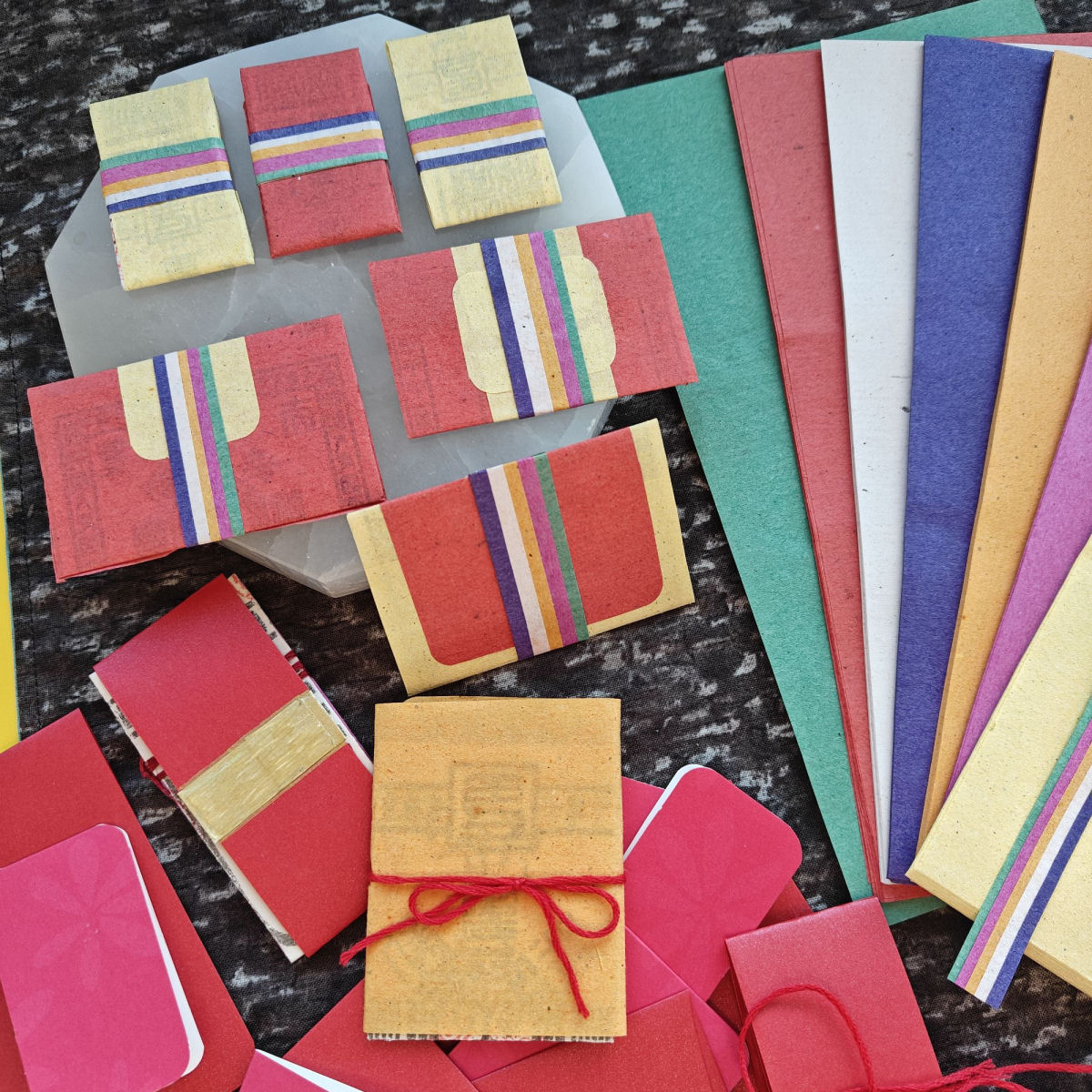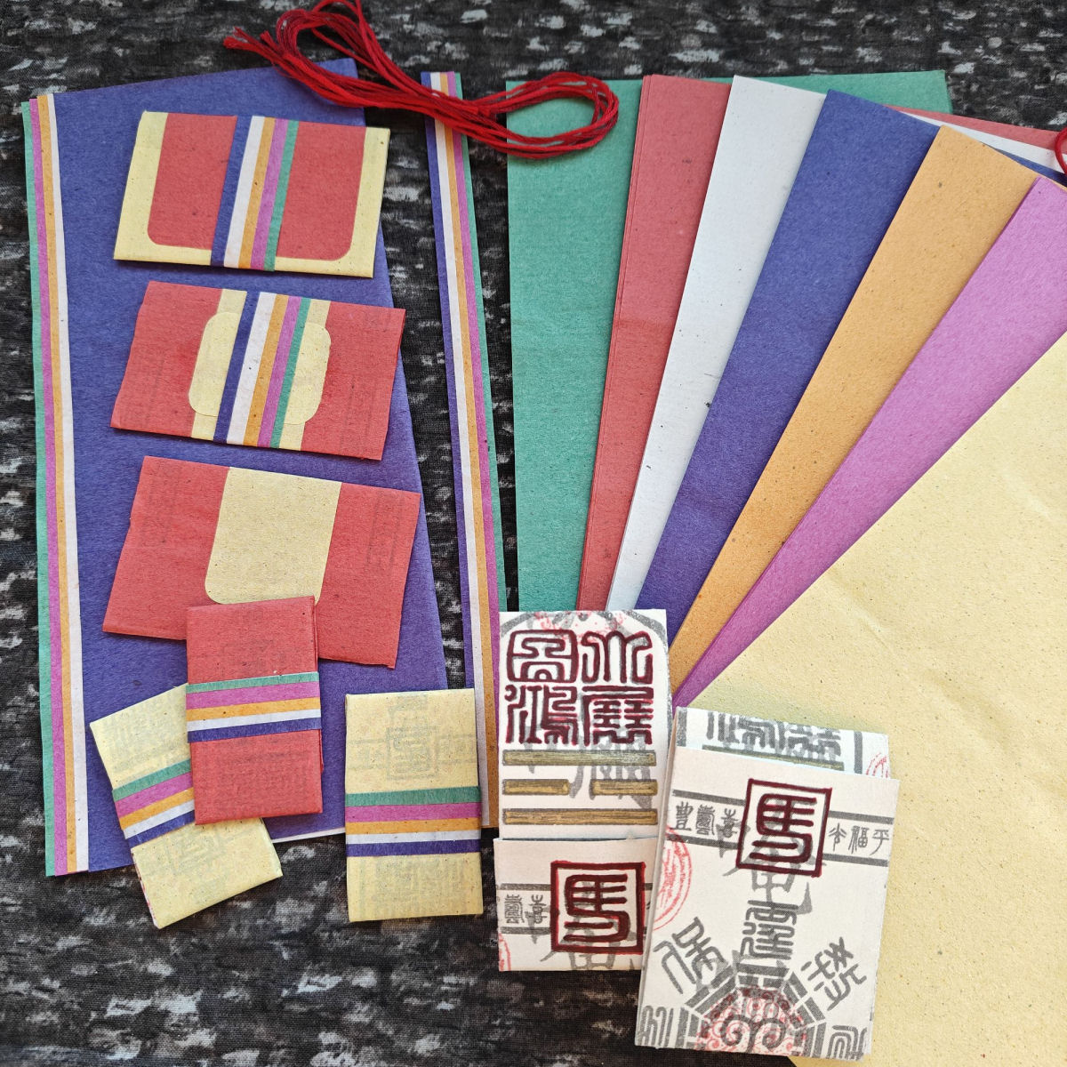 Here in these photos, and this year’s particular batch of protective natal year talismans, I’m using ceremonial rice and sandalwood paper. These types of ritual paper are typically found in sets of five or seven colors, five for the Wu Xing, seven still for the Wu Xing + a very dark and a very light paper set for primordial Yin and Yang respectively. Color symbolism then gets utilized in the crafting of the Fu.