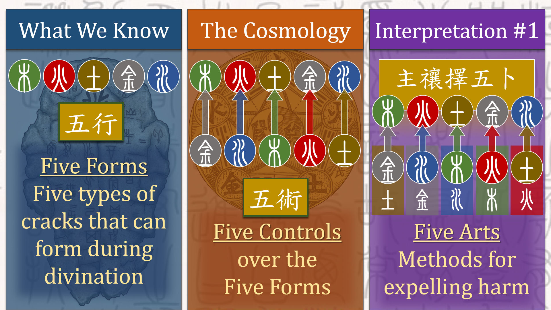 Per the cosmological beliefs of the time, any phenomenon in this universe corresponds with one of these five classifications and another one of the five can defeat it, or mitigate the damage that could potentially be done by the calamity predicted by the Five Forms. And so these five became the five controls over the Five Forms.