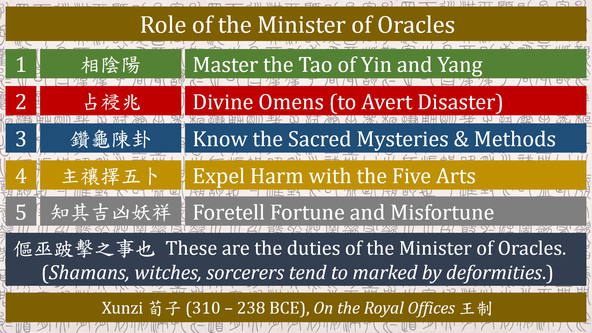 A single line statement from Xunzi (3rd c. BCE) becomes the framework for mastering Chinese folk magic. In this lecture, we unpack the “Minister of Oracles” (Minister of Magic?) in the royal bureaucracy of early China and reveal how it encodes a five-step curriculum.