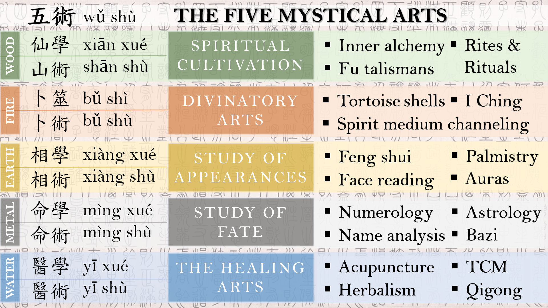 There’s another interpretation of this line, cross-referencing into a popular expression of the mystical arts: Wǔ Shù 五術. The Five Mystical Arts are: Spiritual Cultivation, be that so you possess command over occult powers or so you can transcend and be one with the Tao; Channeling Divinity, Study of Forms and Appearances; Study of Fate; and the Healing Arts. There are many subset practices under these five categories, such as talisman and sigil-crafting, mediumship and channeling, feng shui, palmistry, or face reading, astrology and Ba Zi Four Pillars analysis, or herbology and Traditional Chinese Medicine