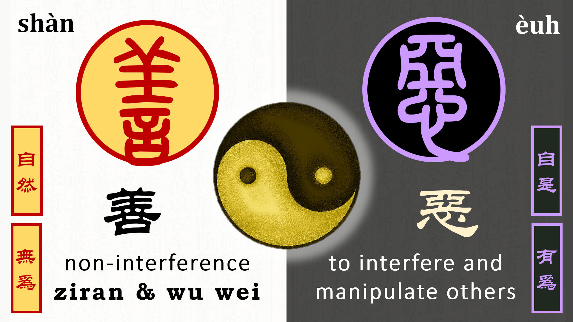 However, we’ve got to address what we mean when we say good vs. evil. The polarity is presented as: Shan 善, which to simplify, we translate as “good,” and Euh 惡, its opposite, evil. But when we say “good,” we mean non-interference, to abide by the doctrines of ziran and wu wei. And when we say the polarity of that, we mean to interfere, to manipulate, to force against another’s nature, to impose your Will over Divine Will or natural Will.