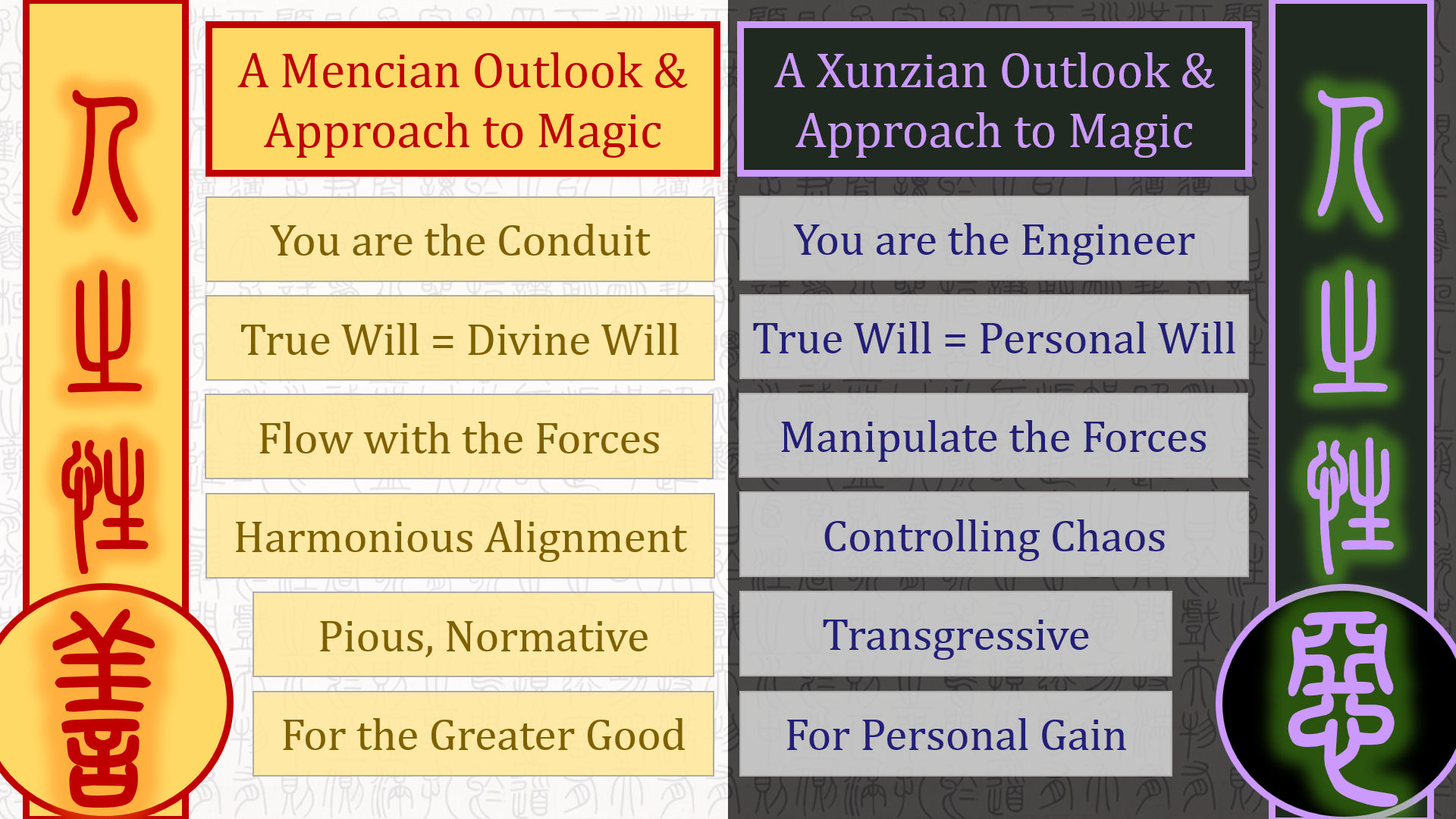 That was a bit of a tangent into Chinese philosophy, but I think it’s relevant to this subject. You know how in Western magical circles, there’s the discourse of “white” vs. “black” magic, and the critique of that binary? There are similar discussions in Eastern magical circles, though slightly different, because we’re not coming from a Christianized view of that binary. Instead, perhaps we might apply the Mencius vs. Xunzi debate.