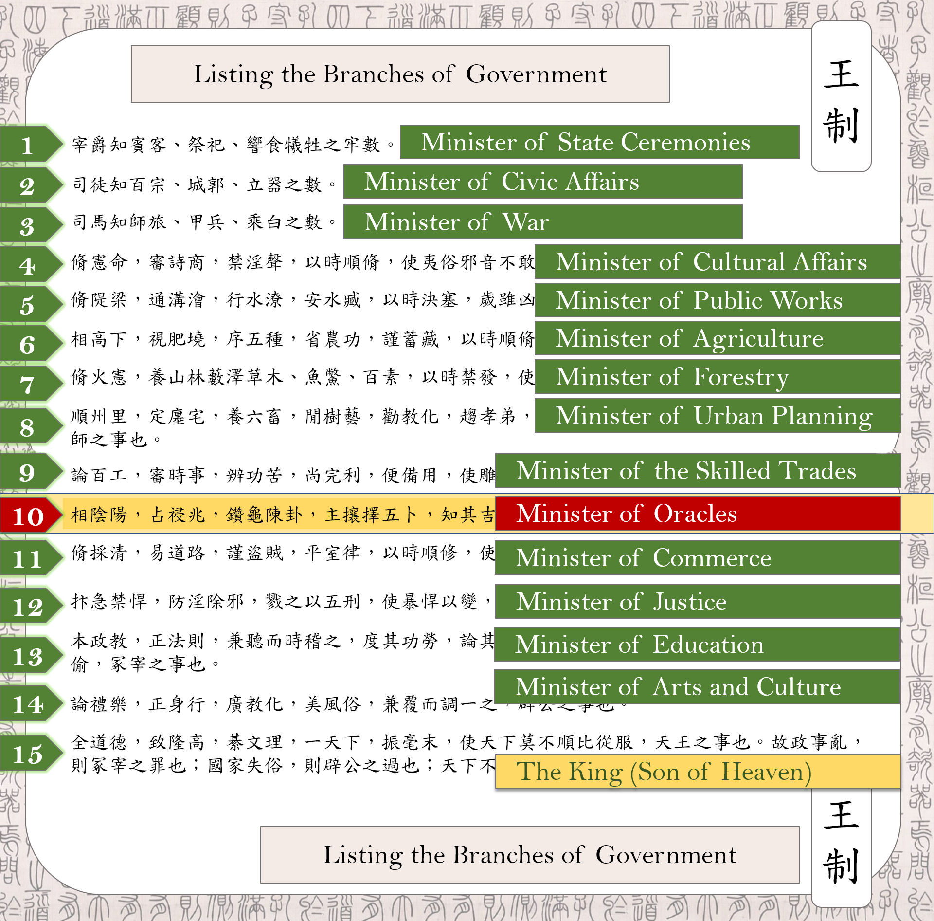 This Minister of Oracles is charged with five key responsibilities, and one of those five can be interpreted to imply the Five Mystical Arts 五卜. So by cross-reference, that’s 10, because the Minister of Oracles must also be skilled in the Five Mystical Arts 五卜.