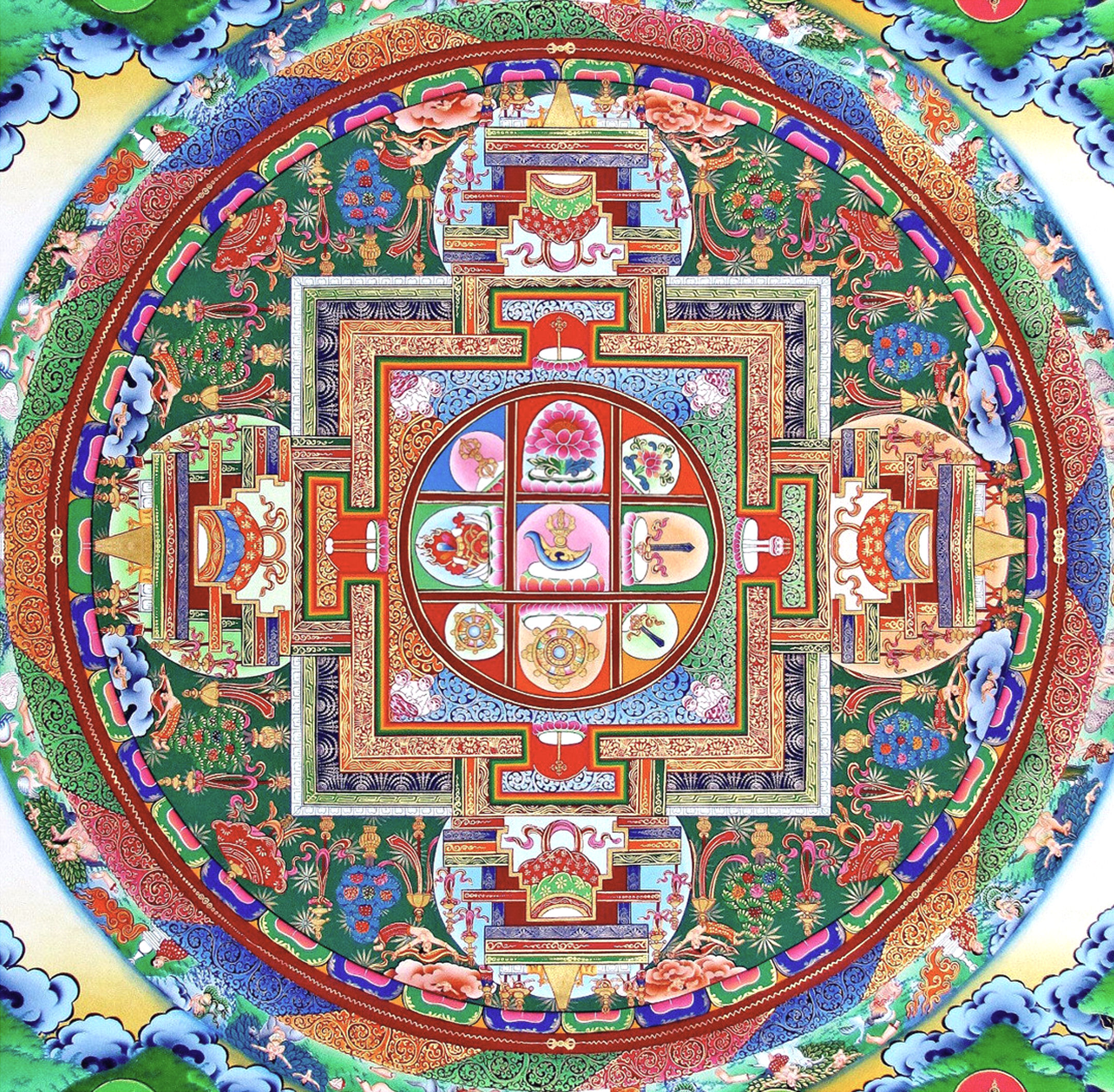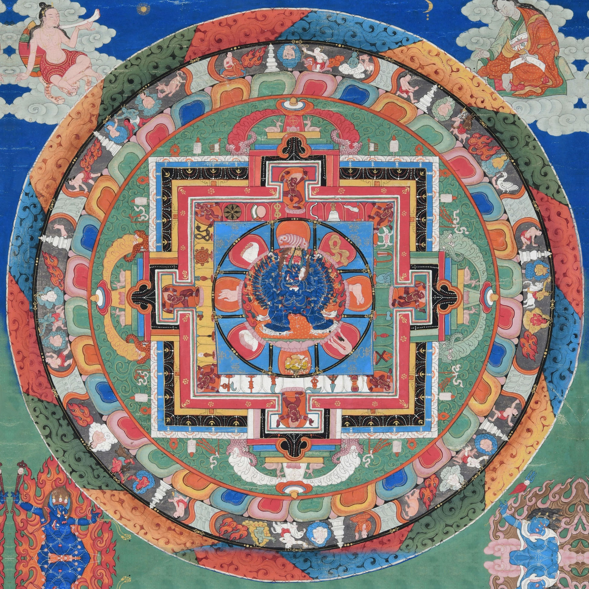A basic, accessible approach is to start with very sturdy, heavyweight pasteboard. If you’re not feeling optimistic about your art skills, a mixed‑media, collage‑style mandala will work. You might hand‑draw and hand‑color the geometric designs, and then print a full‑color image of Yamantaka, the Wrath King, to place at the center of the mandala.