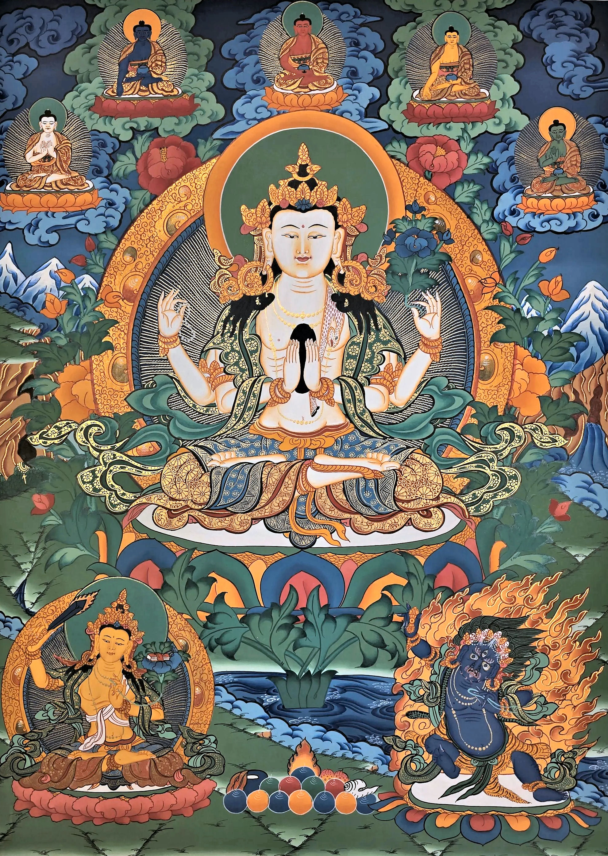 Per the Manjushri Vajra Nama Sutra, “Yamantaka bestows great fear… can subdue demons, for he is the Supremely Powerful One, and he protects the virtuous, therefore he is also the Supremely Virtuous One.” He is considered the most wrathful of the wrathful deities, and while he’s terrifying, he’s deeply compassionate.