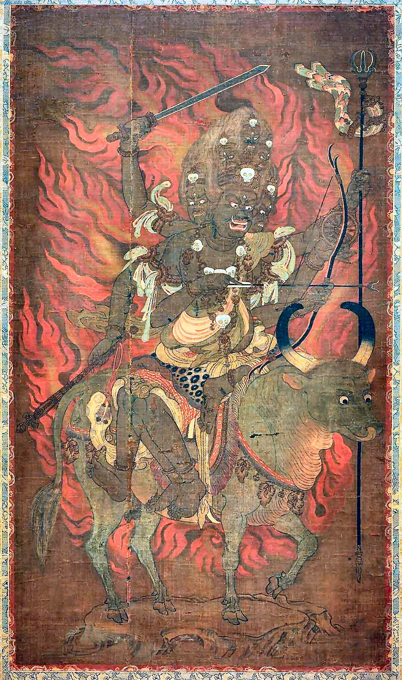 In Rites, he’s described as having six faces, six arms, and six legs. Either he’s depicted with the face of a water buffalo or he’s a wrath king riding a water buffalo. He’s also adorned with skulls and bones, wielding an array of weapons, or drinking blood out of a skull turned into a bowl.