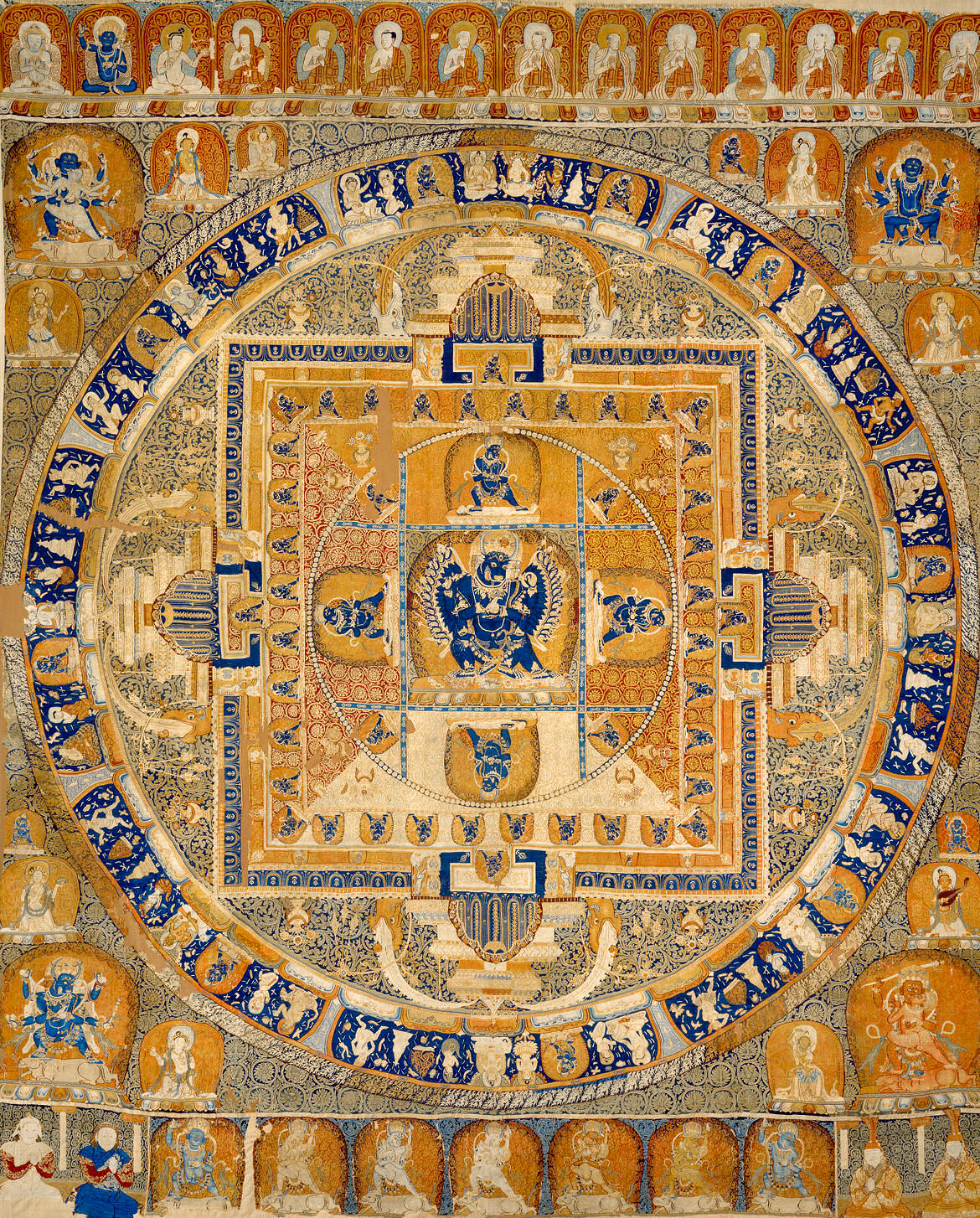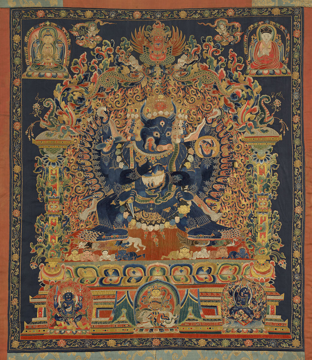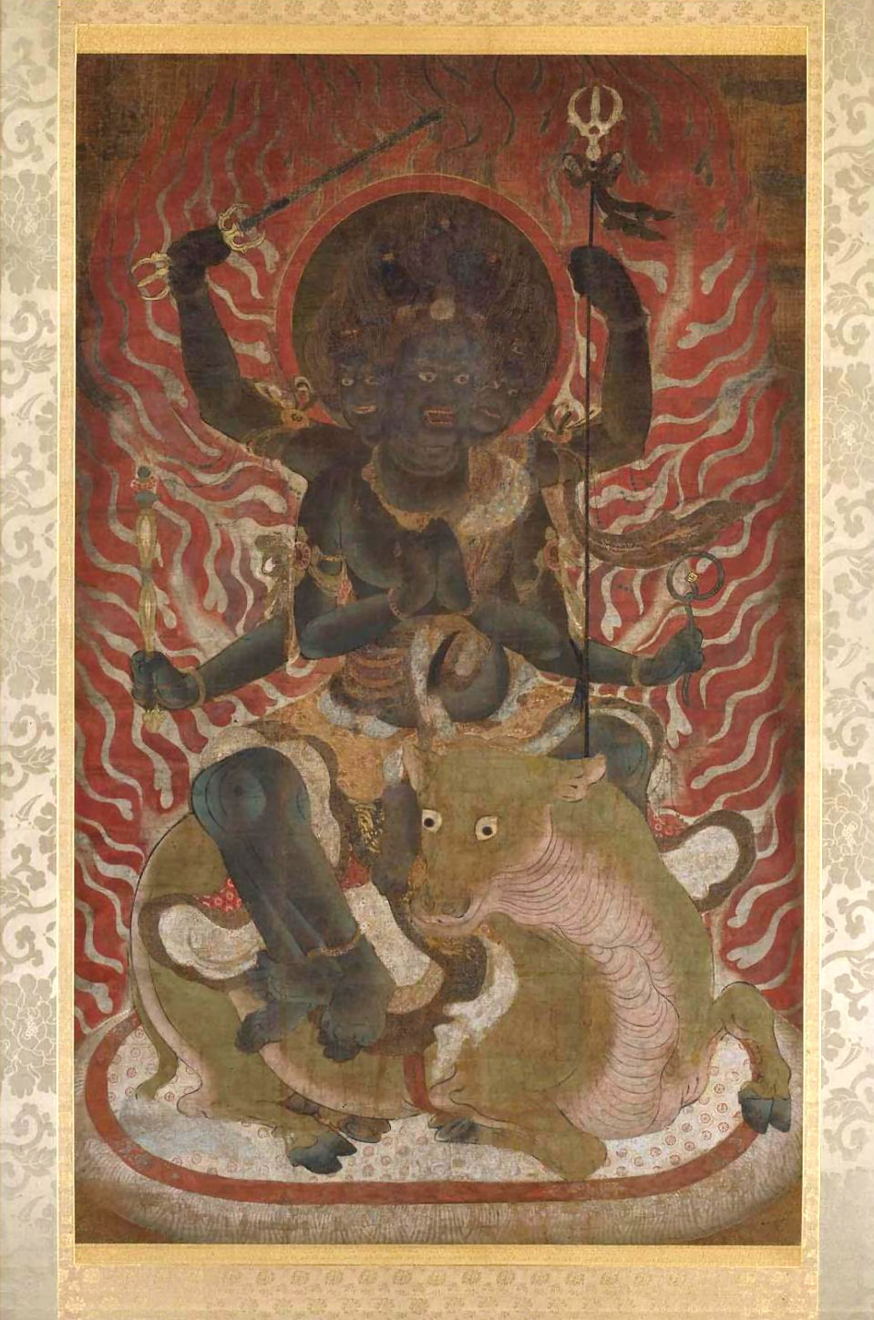 Alternatively Yamantaka’s referred to as Vajrabhairava (大威德金剛, daweidejingang), vajra meaning a diamond thunderbolt, or a ritual scepter that signifies indestructible force and power, and bhairava, meaning a wrathful and fierce manifestation of a divine force and power, is another name for Yamantaka. Here, the Chinese name 金剛 (jingang) means Vajra, emphasizing this divinity’s role in tantra.