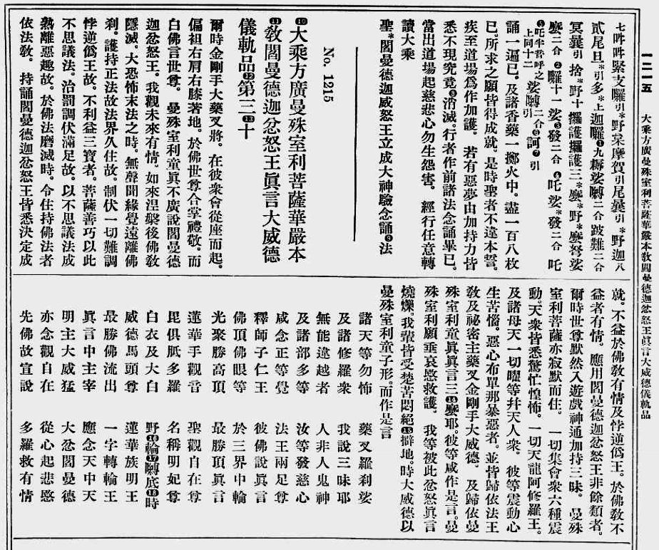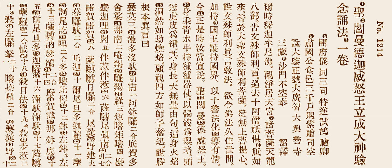 Returning to the CBETA (Chinese Buddhist Electronic Text Association) archives, you might also be interested in this excerpted passage on Yamantaka siddhi, or attainment: The Mantra (Dharani) of Yamantaka, the Wrathful King, and the Rites of Yamantaka (大乘方廣曼殊室利菩薩華嚴本教閻曼德迦忿怒王真言大威德儀軌品).