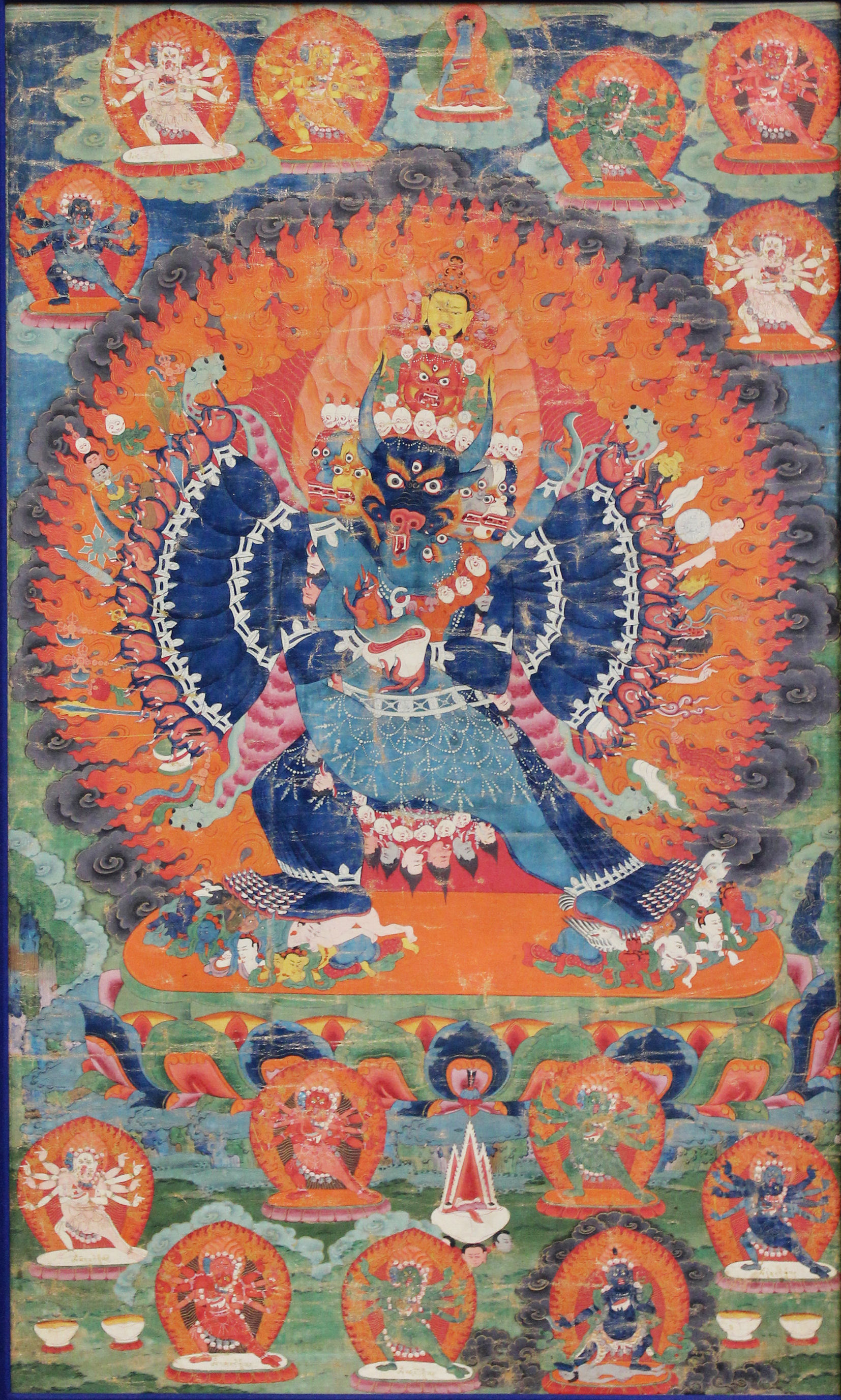 Depictions of Yamantaka are commonly of him as dark-skinned, be that blue, black, or dark brown. While he’s more frequently rendered with many arms, many legs, and maybe even many faces, also, not always. Sometimes it’s nine faces, sometimes four but only three showing, or eight faces with only seven showing.