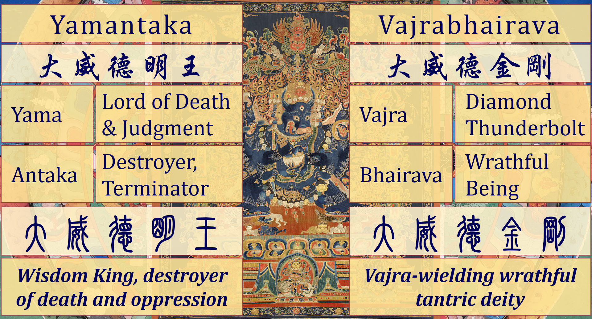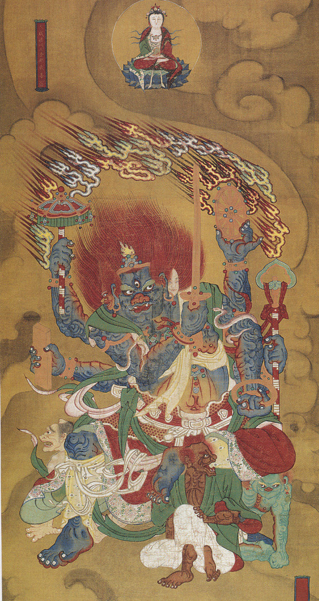 Yamantaka (大威德明王, daweidemingwang) refers to the Destroyer, the Terminator, or ender, Antaka, of Yama, the Lord of Death, judgment of our afterlife, and ruler of the Hell Realms. Which is to say Yamantaka is the nemesis of Death itself. The focus here is on Yamantaka’s role as a Wisdom King (明王, mingwang), who possesses the power to keep death at bay and also, to combat and defeat oppression. In Japanese Shingon Buddhism, he is Daiitoku Myōō.
