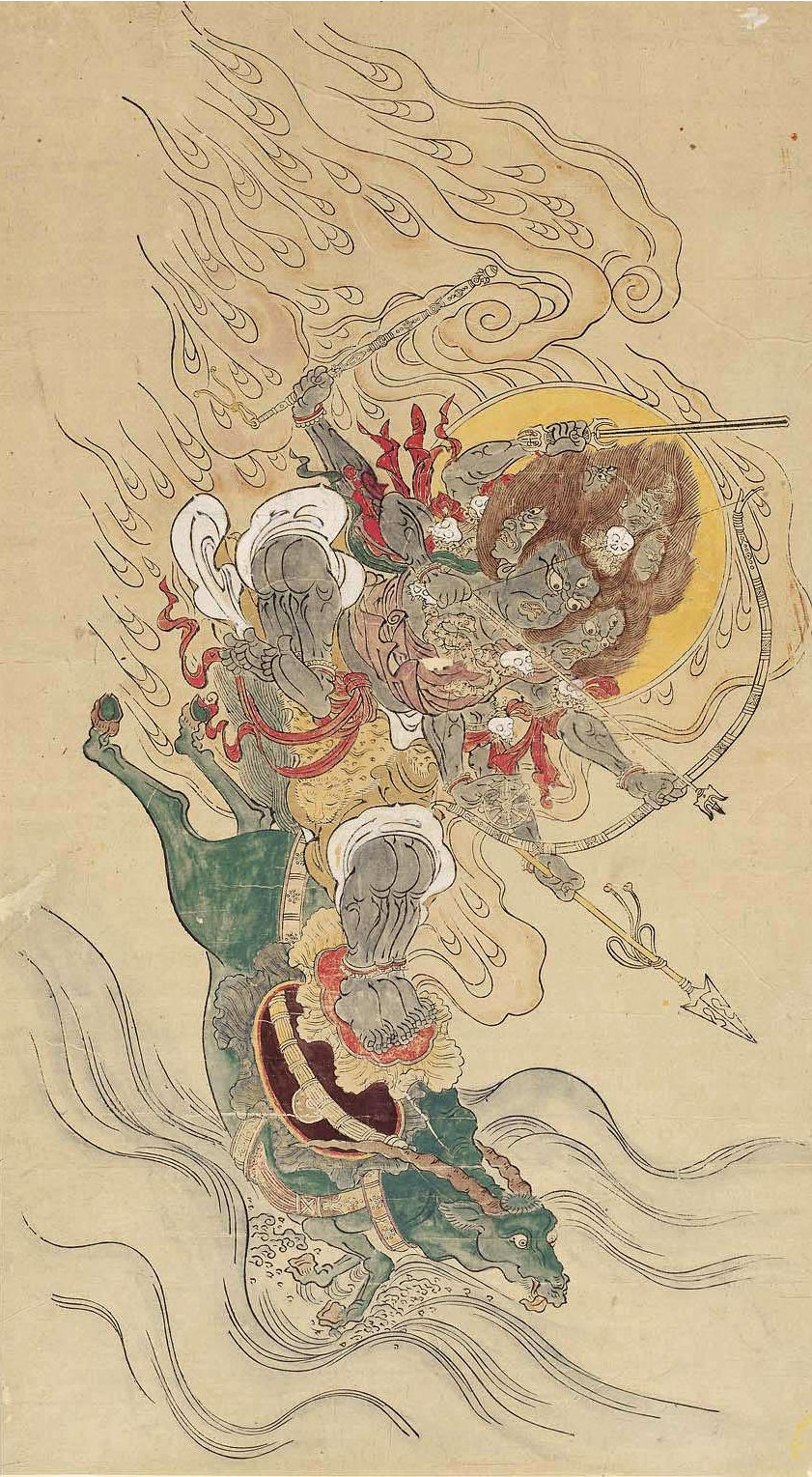 As the nemesis to the King of Hell, Yamantaka force is wielded to combat the four demons 四魔: Mara 天魔, demons of disease 病魔 (meaning, Yamantaka in the role of healer of severe illnesses, particularly the unexplained and fatal kind), demons of disaster 煩惱魔, and the demon Death 死魔.