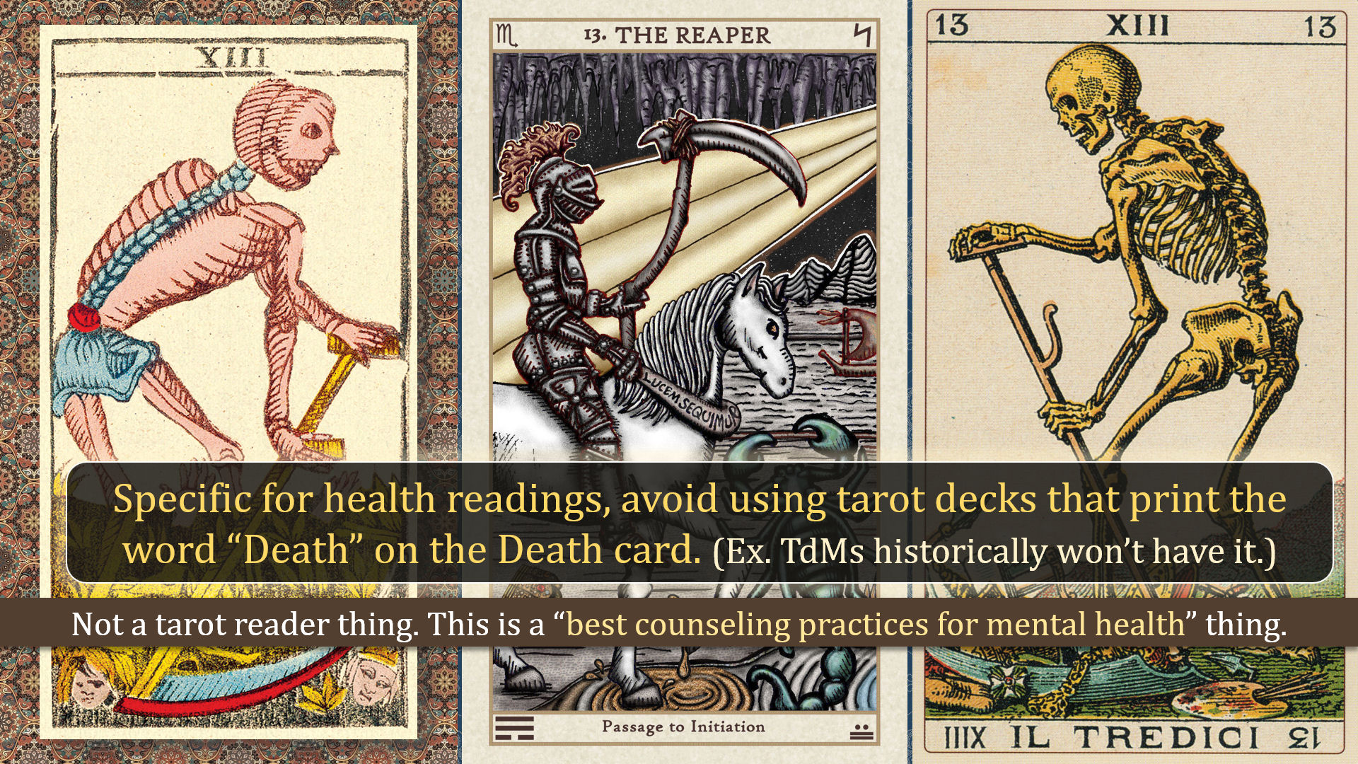I noted that specific to health readings, opt for a deck where the Death card does not print the word “Death” on it. E.g., most historical TdM decks won’t have it; likewise, many modern decks have an alternate title instead.