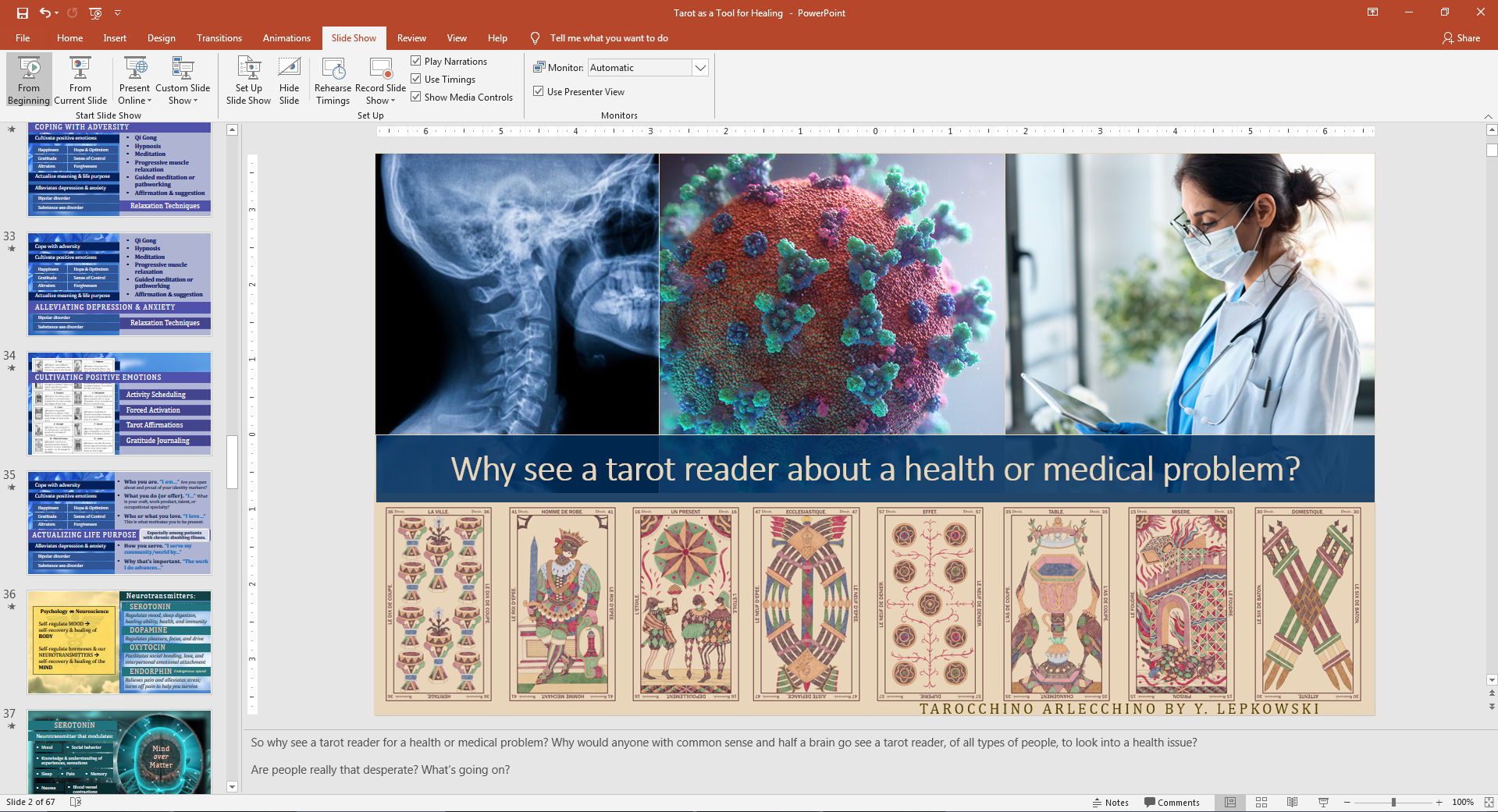 The subject of this presentation was one more often seen as taboo: using the tarot to do health readings.