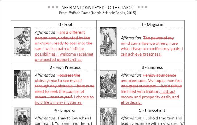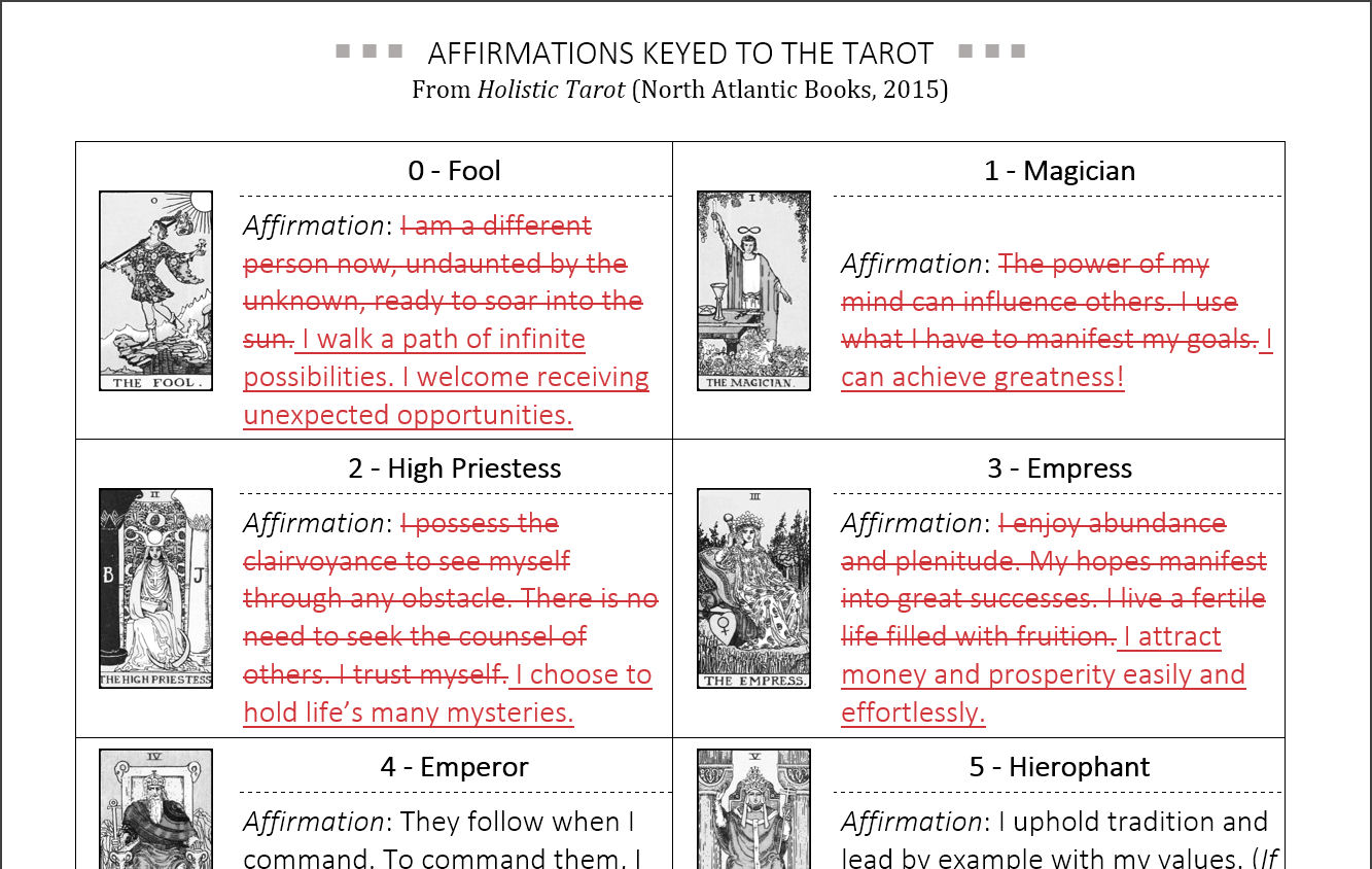 Download the DOCX file of the handout. Select and copy the section “Affirmations Keyed to the Tarot” and paste it into a new document file. Read through each affirmation drafted for the 78 cards. Keep the ones you like. Delete the ones you don’t like and write in your own. This reference file of affirmations will be your go-to correspondences when advising your clients.