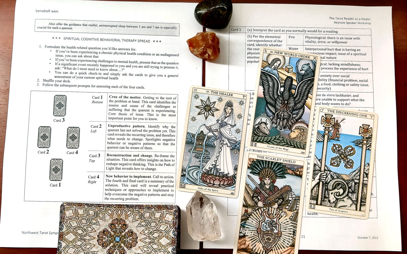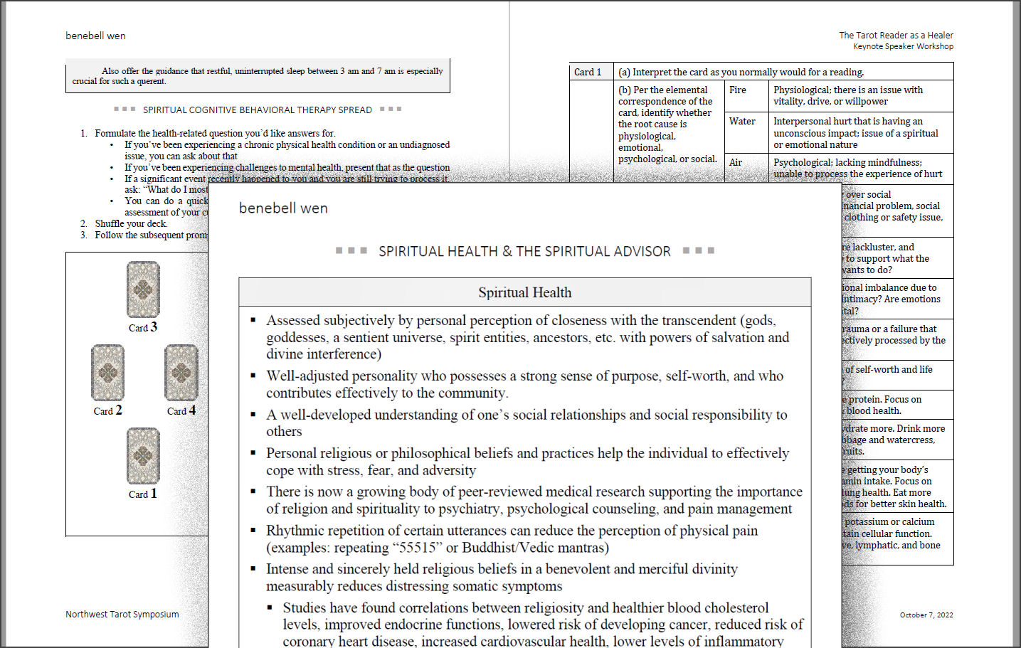 During the 2022 keynote and workshop, we talked about how, if and when doing a tarot reading on a health question, the tarot reader’s main focus is on the querent’s spiritual health.