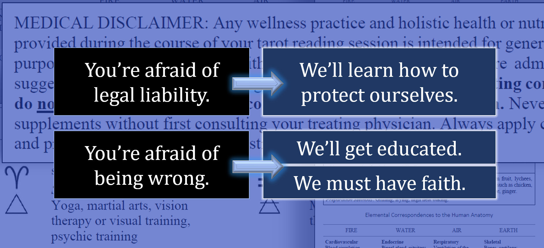 Two fears cause tarot readers to refrain from doing health readings with the cards. The first is fear of legal liability. What if you’re accused of the unauthorized or unlicensed practice of medicine? We’ll talk about ethics and disclaimers to learn how we can best protect ourselves from liability.