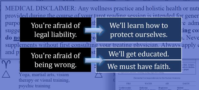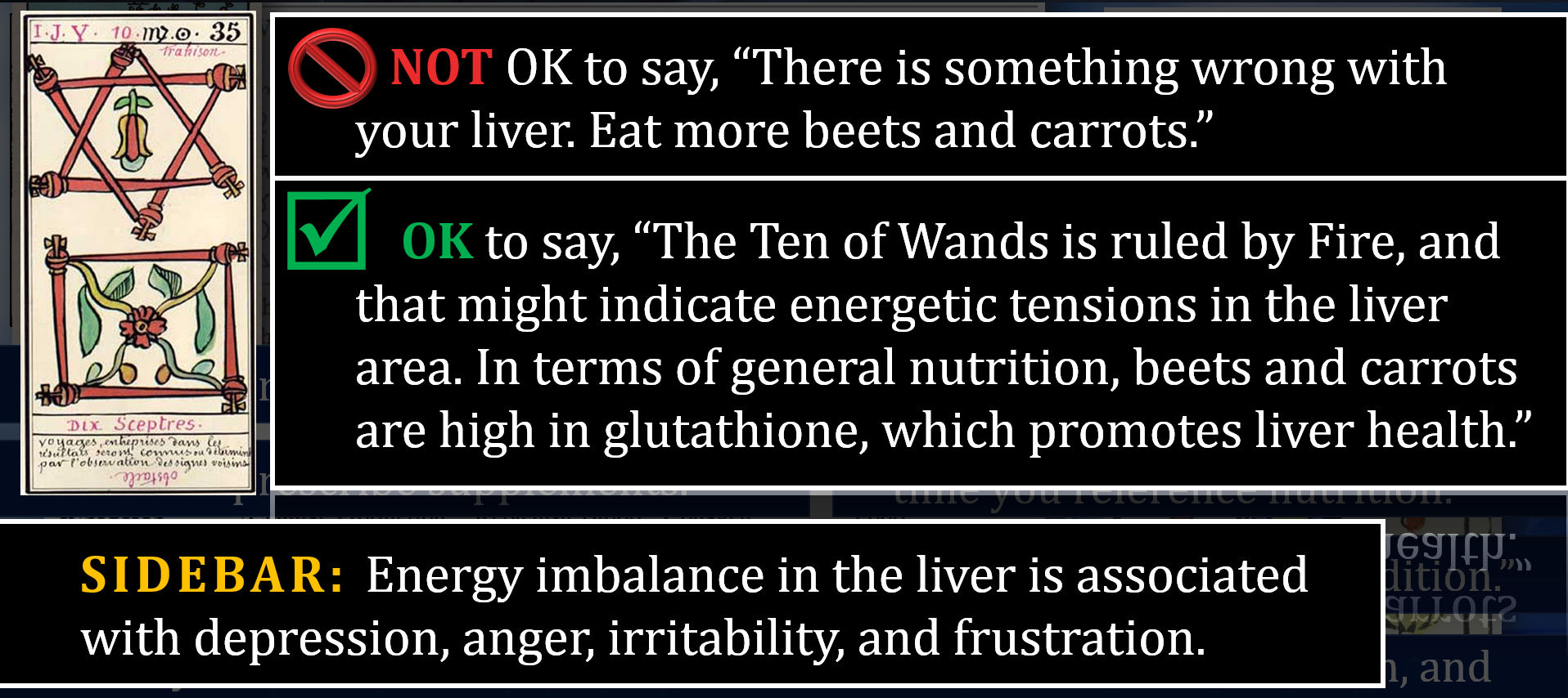 During the presentation, we also talked about how to word your health readings. You want to make sure your wording never risks being interpreted as giving a diagnosis of a condition or affliction. Talking about energy, knots of tension, qi life force, reiki, and referencing the energy as established metaphysical correspondences for tarot cards is an additional layer of protection from being misinterpreted as giving a diagnosis.