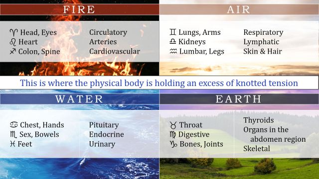 Thus, for example, if the querent’s overall tarot reading is Fire-dominant, there may be issues around depletion, restlessness, dehydration (be that physiological or figurative), and irritants that need their attention. If their reading is Earth-dominant, there may be stiffness, fatigue, and issues around low energy levels they need to pay attention to.