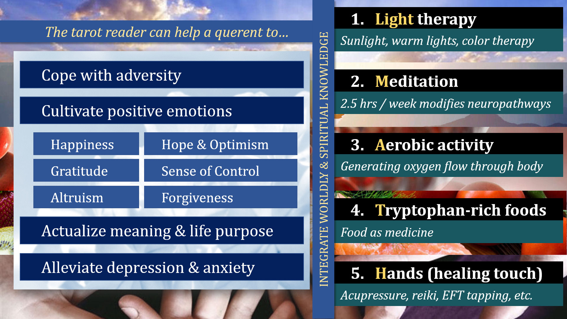 So in summary: Part I: We account for our four key objectives as tarot readers who are assuming the role of spiritual advisor. Then, Part II: We give our querents the tools to cope with adversity and also facilitate how to re-wire their minds so they are better at self-healing (both physiologically and psychologically).