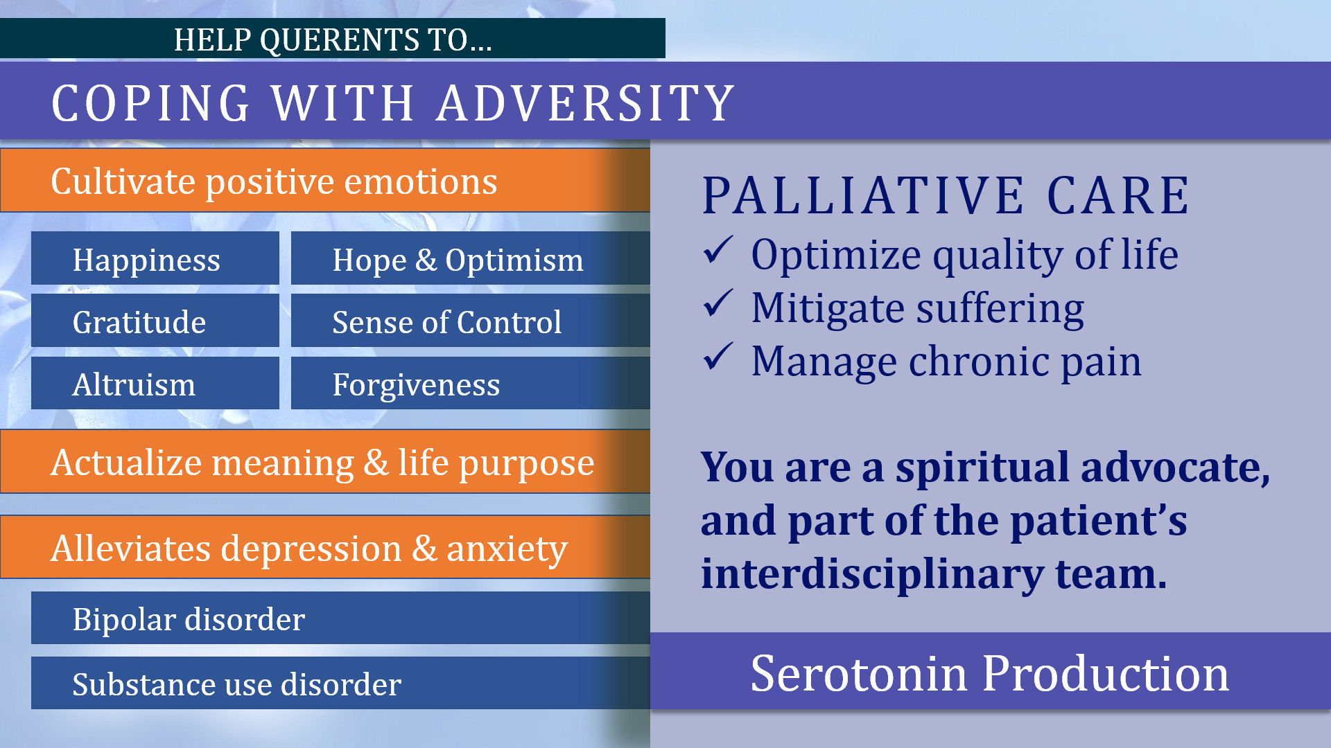 I’m inspired by techniques applied in palliative care, where an interdisciplinary team of different professionals come together to help a terminally ill patient (or one dealing with a severe chronic illness) optimize quality of life, mitigate suffering, and manage chronic pain. As a spiritual advocate, you’ll figure out what your role is and how you can contribute to those goals through faith and faith healing.