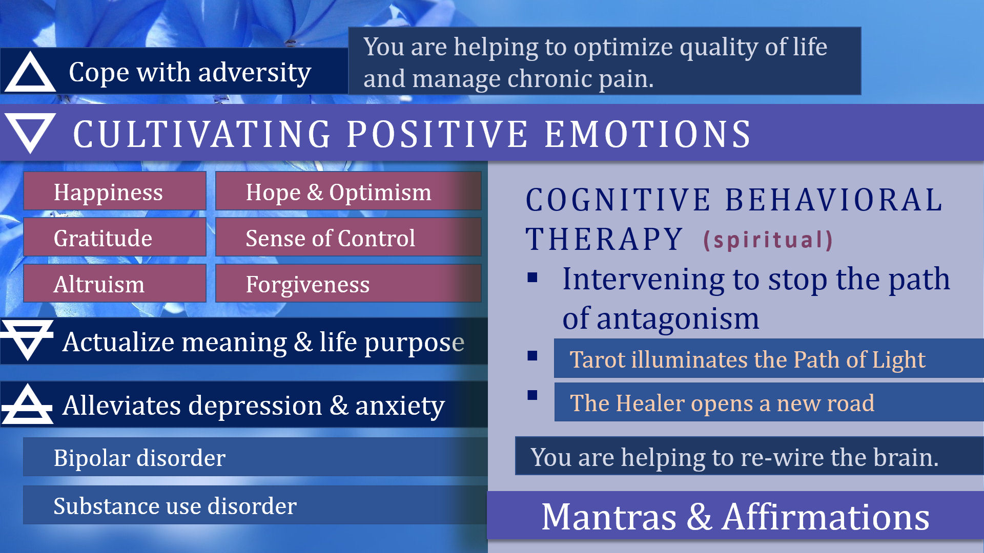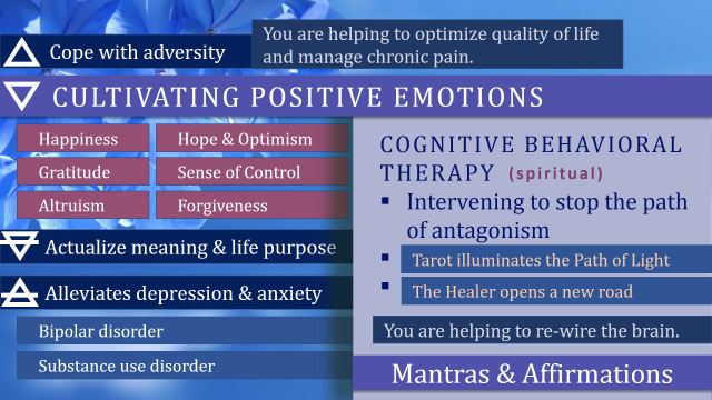 Another one of your core objectives as a spiritual advisor and tarot healer is helping your querents cultivate positive emotions. We take inspiration from cognitive behavioral therapy where we identify negative or self-destructive behavioral patterns and then “re-wire” or “re-program” ourselves to promote positive and productive behavioral patterns.